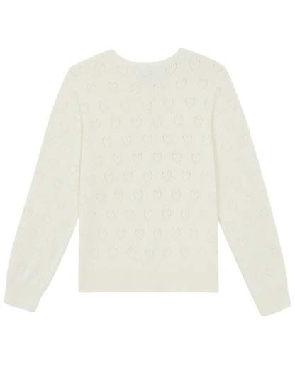 Cardigan avorio da bambina realizzato in cotone. Presenta motivo traforato a forma di cuore, collo tondo, maniche lunghe, chiusura frontale con bottoni e finiture a coste.