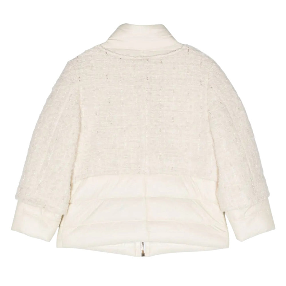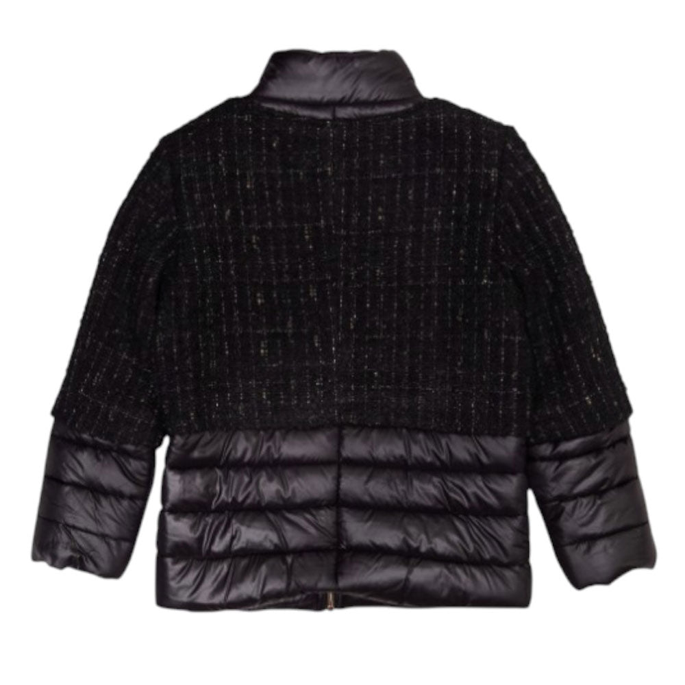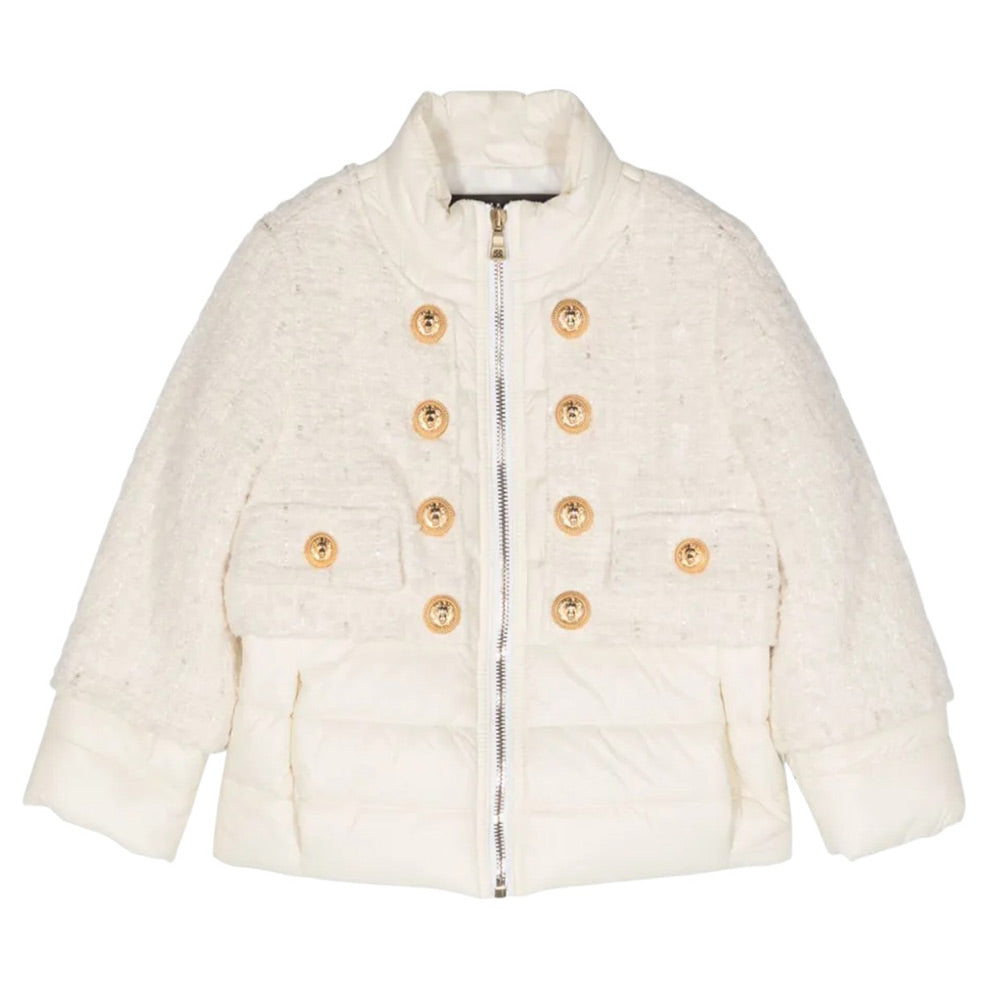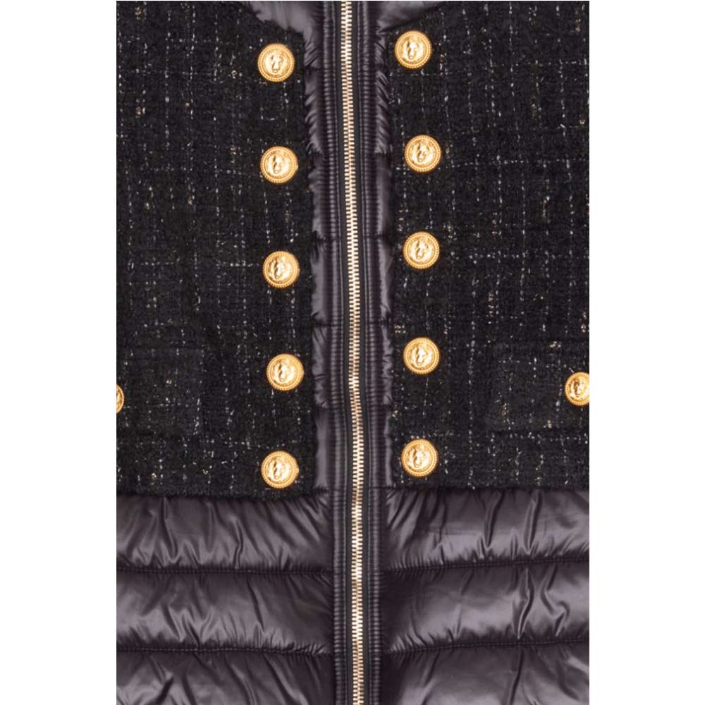 Giubbino imbottito realizzato in bi-tessuto. Caratterizzato da design trapuntato in nylon, parte superiore in tweed di misto cotone cotone, collo alto, chiusura frontale con zip, maniche lunghe, due tasche laterali a filetto e orlo dritto. È decorato con bottoni dorati con logo sulla parte anteriore.