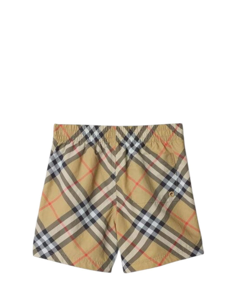 Boxer mare realizzati in nylon stretch con fodera parziale in rete. Il modello è decorato dal Burberry Check stampato, vita elasticizzata, tasche laterali a bustina, tasca posteriore applicata con chiusura in velcro.