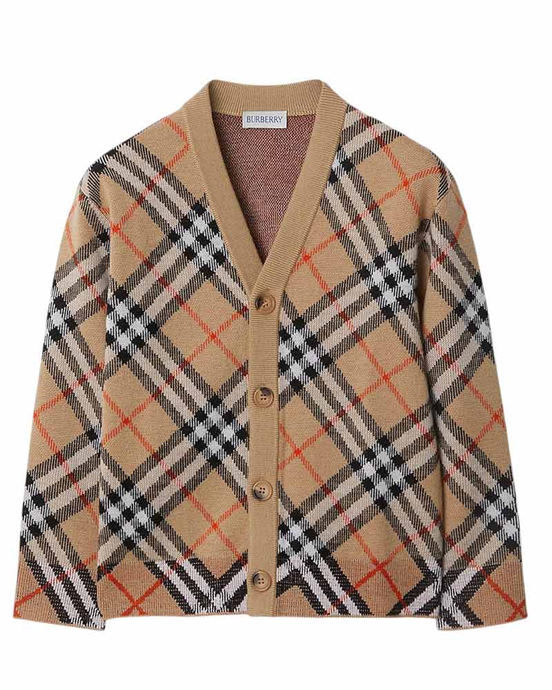 Cardigan in lana con iconica fantasia Burberry Check in jacquard, caratterizzato da scollo a V, maniche lunghe, chiusura frontale con bottoncini e finiture a costine.