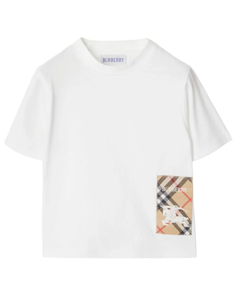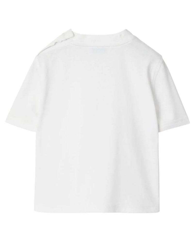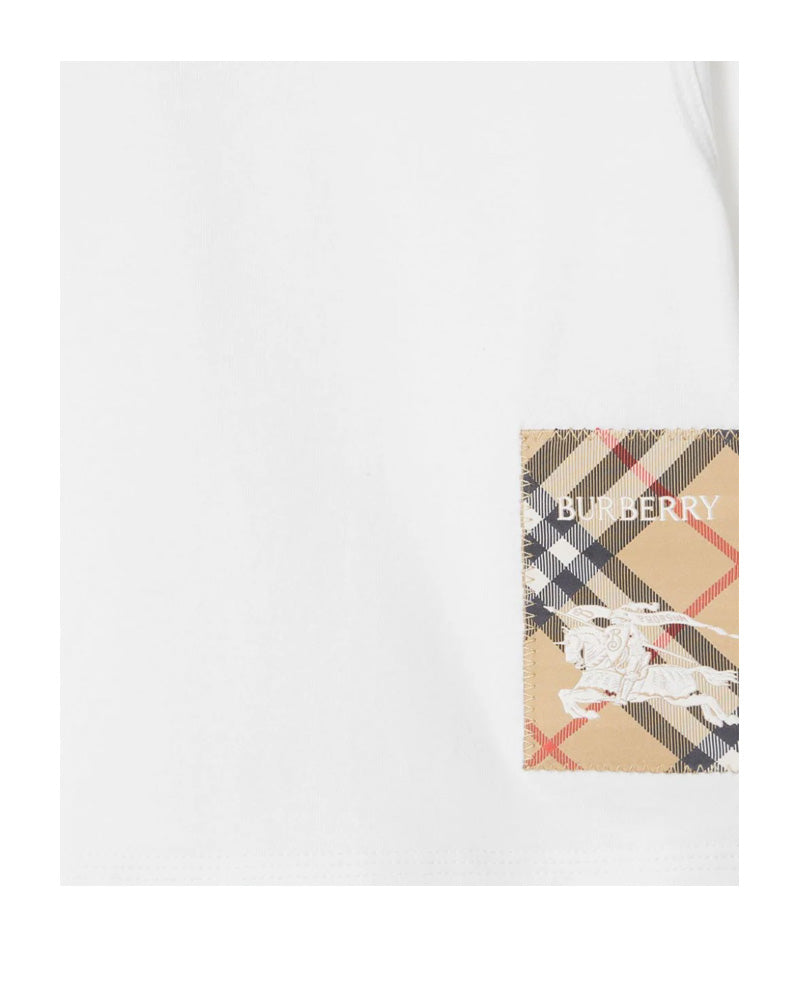T-shirt girocollo a maniche corte in jersey di cotone. Il modello presenta un'applicazione intessuta con Burberry Check, logo ed Equestrian Knight Design. Collo a costine, chiusura con clips sulla spallina, applicazione con etichetta Burberry Check sul davanti.
