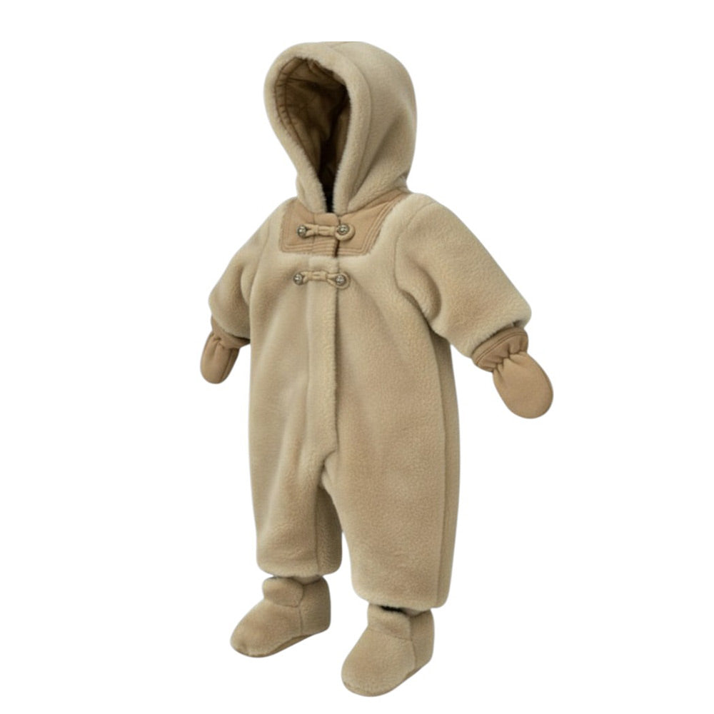 Eskimo realizzato in morbida pelliccia ecologica, con inserti in misto lana. Presenta cappuccio fisso, chiusura frontale con zip e alamari, maniche lunghe, polsi e caviglie a costine. È dotato di muffole e babbucce staccabili.