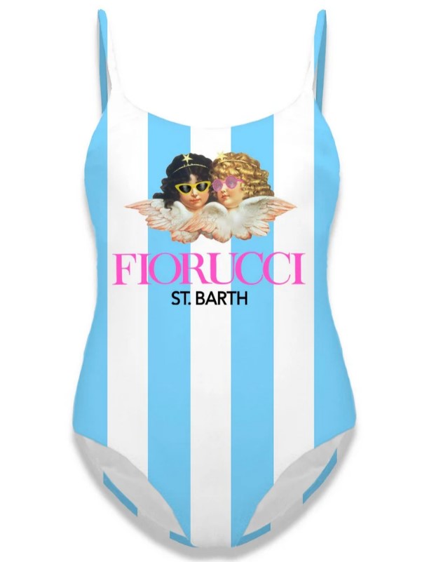 Costume da bambina intero con fantasia a righe all over e stampa Fiorucci frontale. Spalline regolabili.
