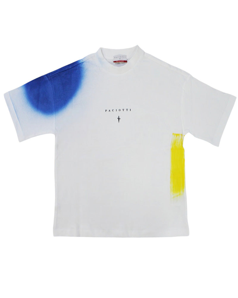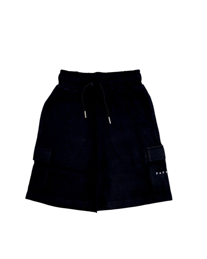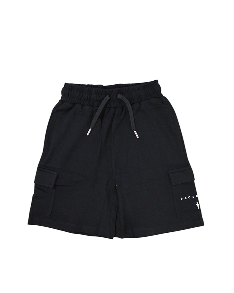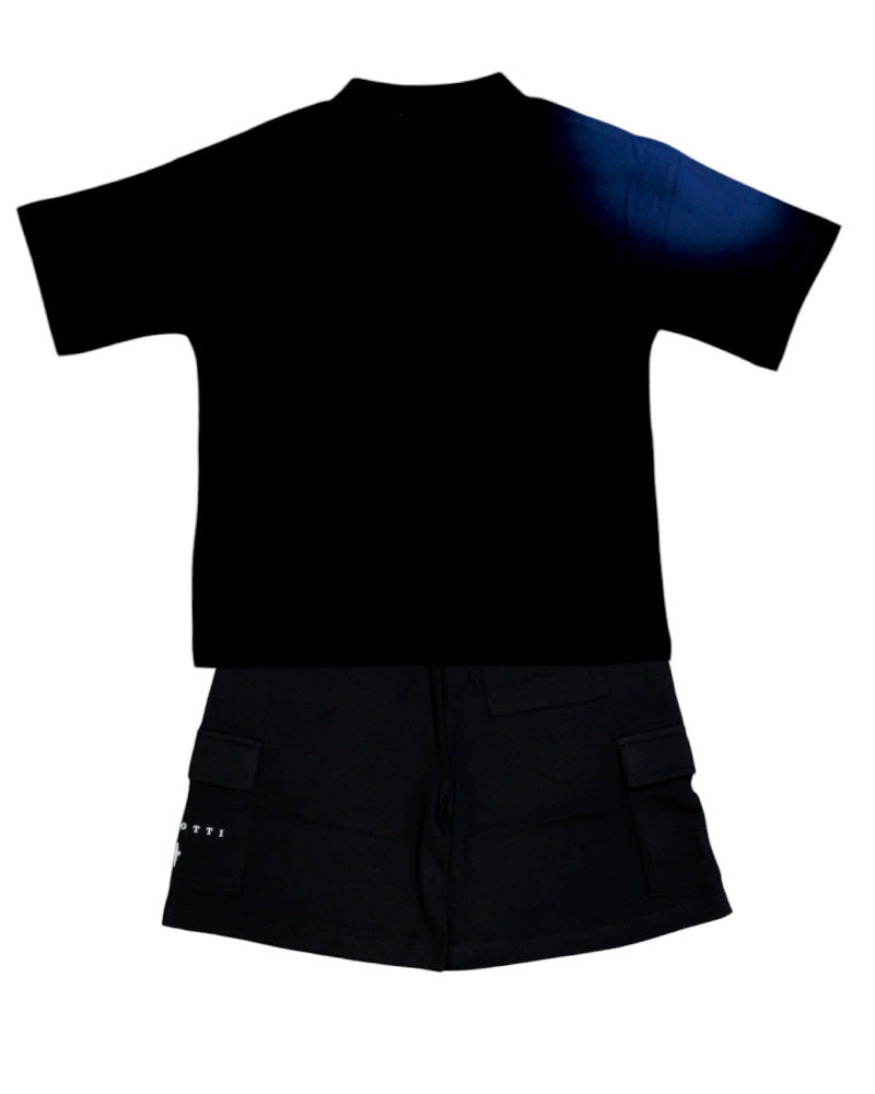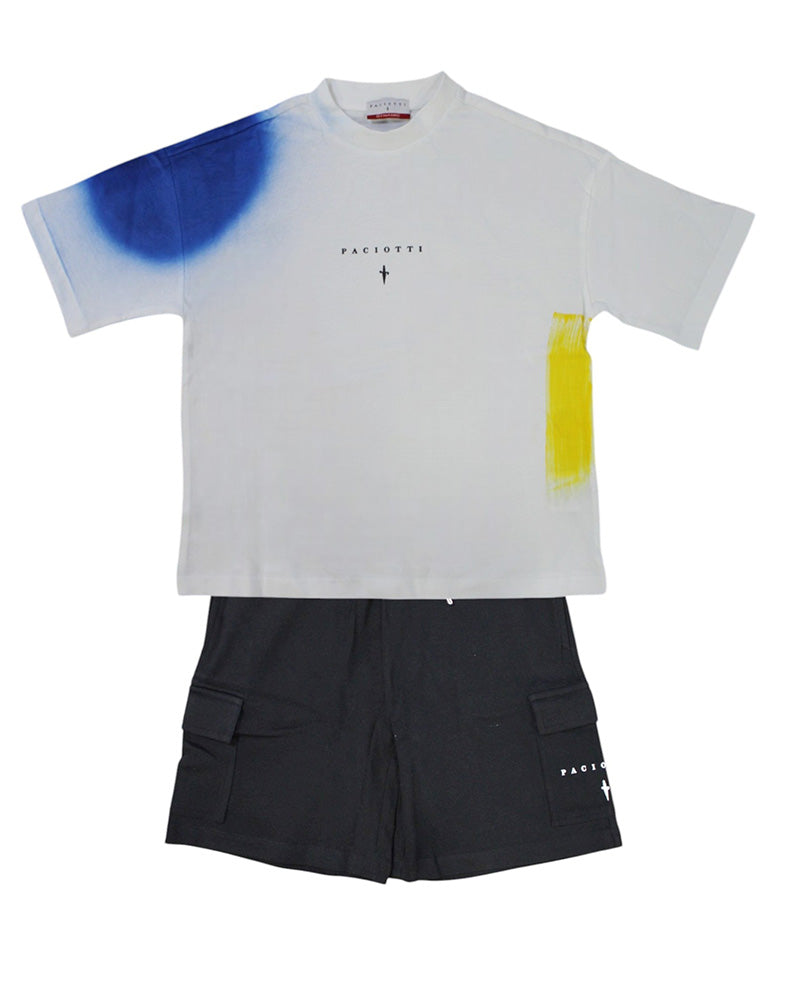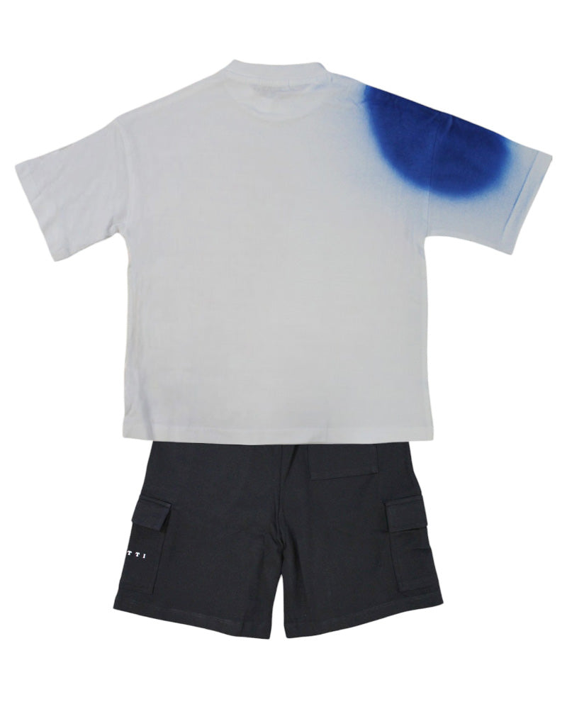 Completo composto da bermuda con elastico in vita, tasche laterali applicate e t-shirt girocollo manica corta con logo stampato sul davanti.