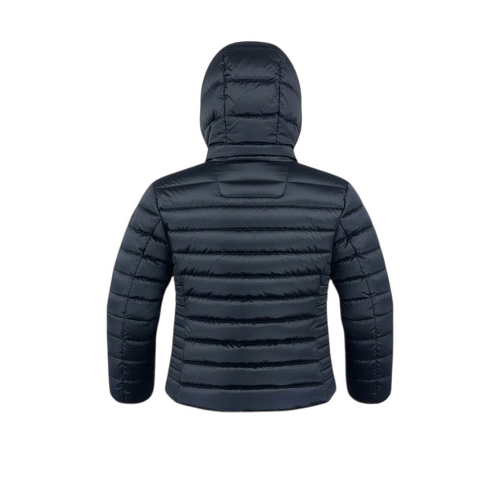Giubbino 100 grammi realizzato in nylon da neonata. Presenta design trapuntato, cappuccio fisso, chiusura frontale con zip, maniche lunghe con polsi elasticizzati, due tasche laterali a filetto con zip. È decorato con patch logo applicata sulla manica.