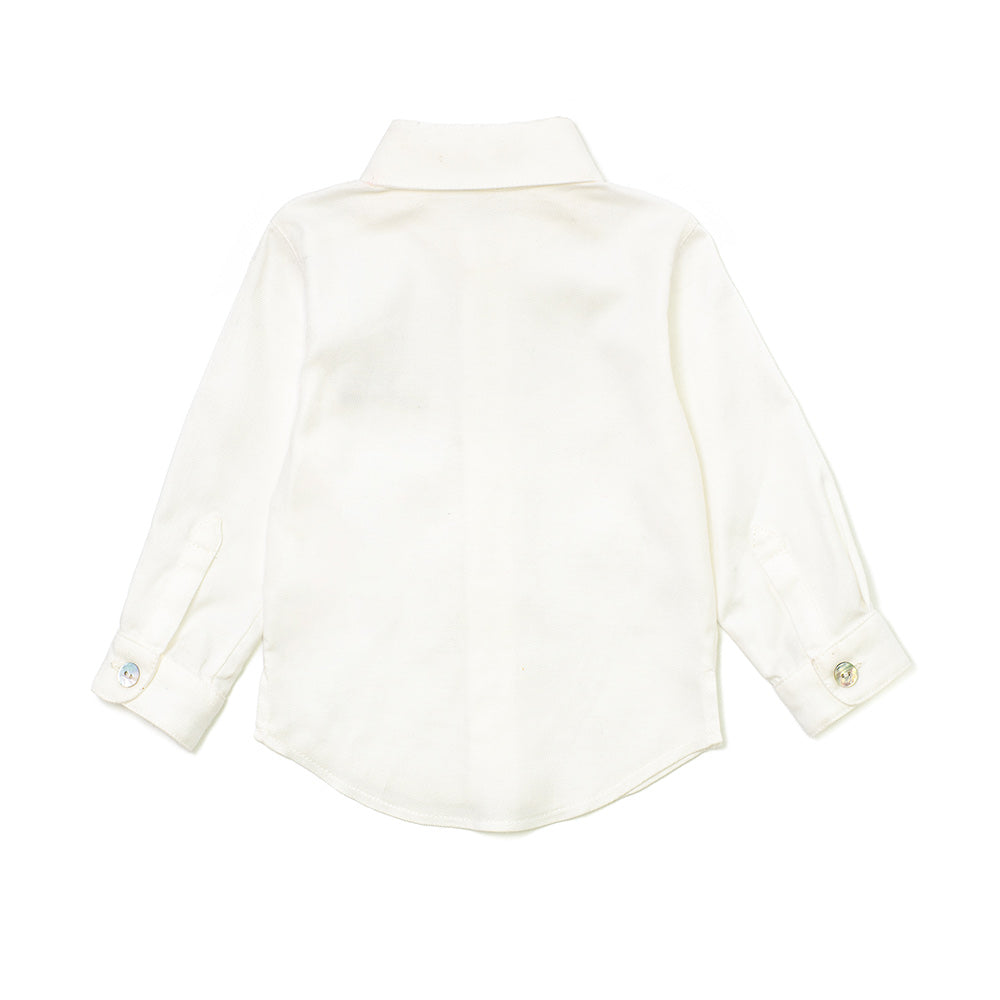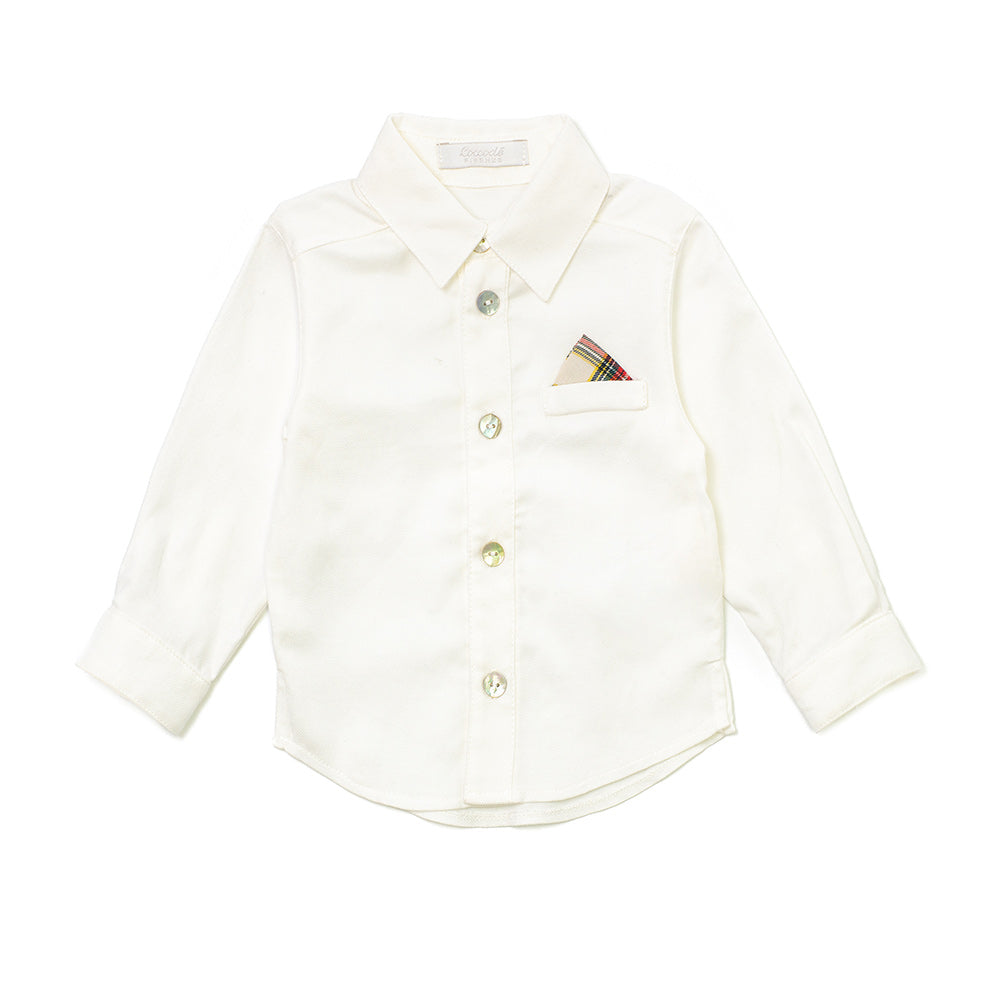 Camicia realizzata in jersey di misto cotone, caratterizzata da colletto a punta, chiusura frontale con bottoncini, maniche lunghe e orlo curvo. È decorata con taschino applicato sul petto, arricchito da un fazzoletto in tessuto tartan.