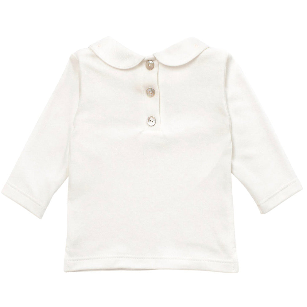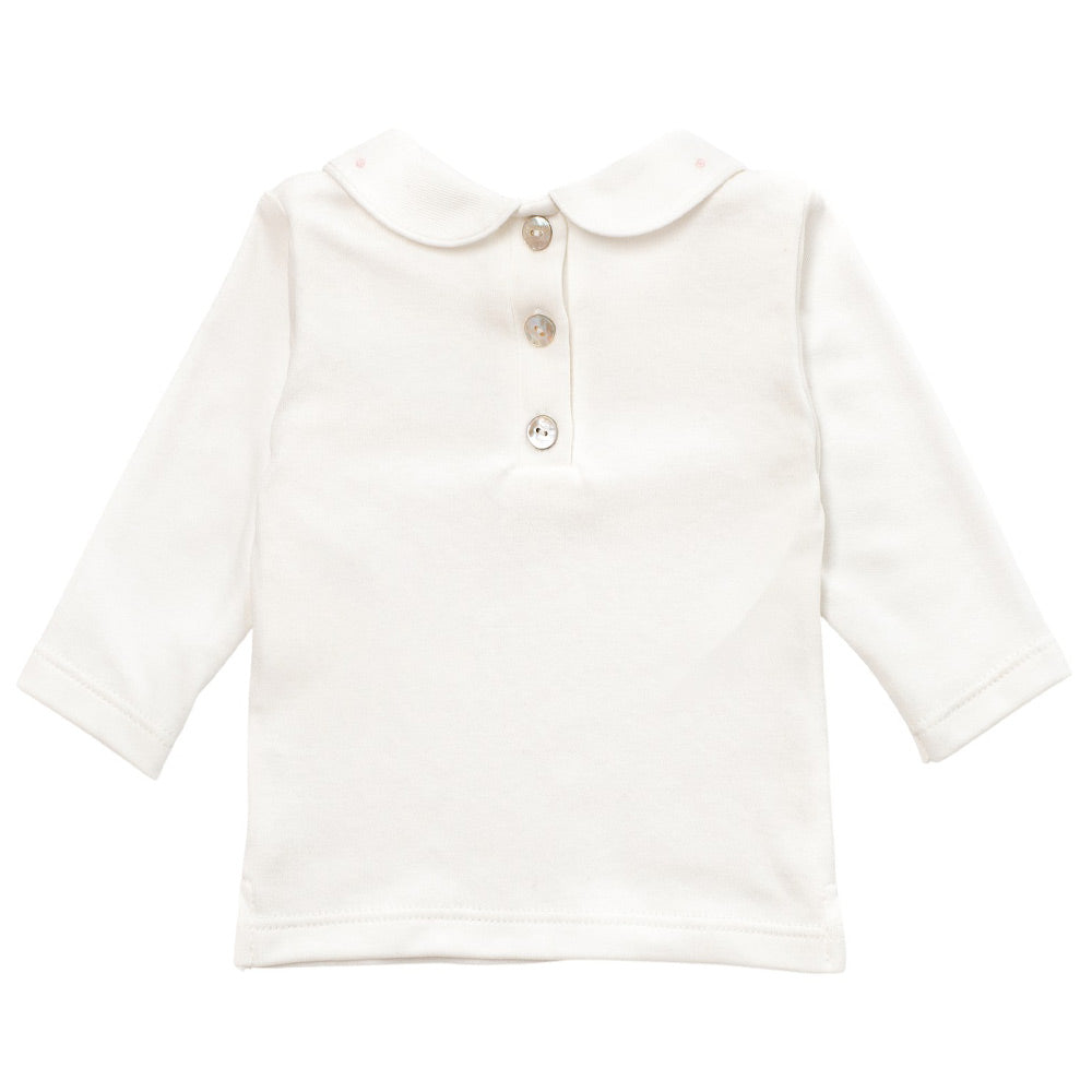 T-shirt realizzata in jersey di cotone, caratterizzata da colletto Peter Pan con ricami, maniche lunghe, chiusura con bottoncini sul retro e orlo dritto.