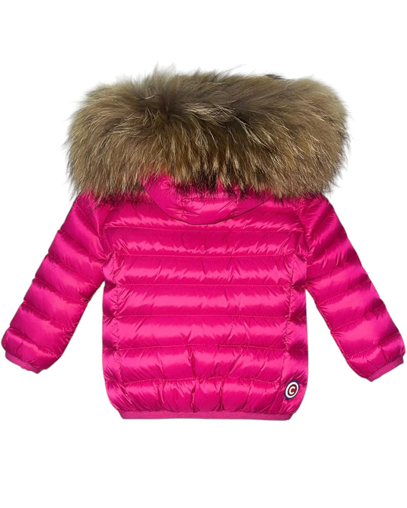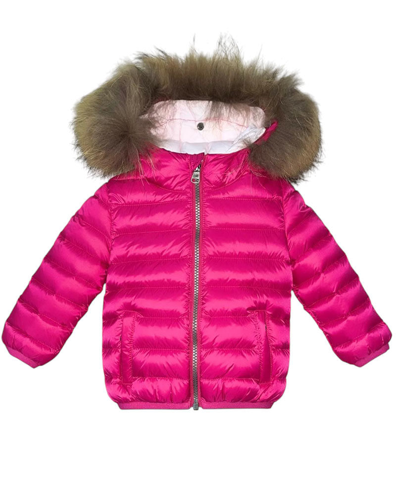 Giubbino imbottito da neonata, realizzato in nylon semilucido. Presenta design trapuntato, cappuccio fisso con bordo in pelliccia di murmasky, chiusura frontale con zip, maniche lunghe con polsini elasticizzati, due tasche laterali a filetto con zip e orlo elasticizzato. È decorato con patch logo applicata sulla manica.