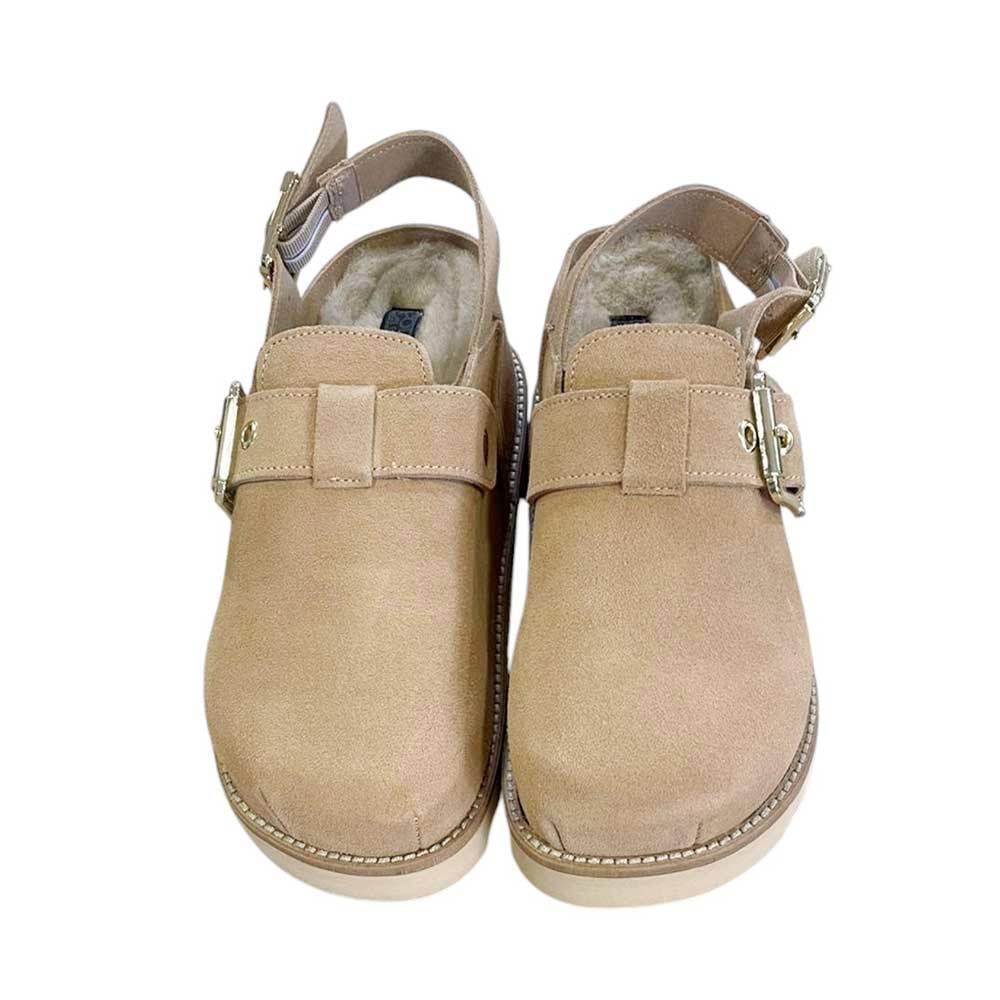 Scarpa sabot in pelle scamosciata color cammello, con suola spessa in gomma beige e dettagli in metallo dorato. Presenta una grande fibbia laterale con logo inciso colors of California cinturino regolabile sul tallone e finiture curate. Stile casual-chic, perfetto per un look confortevole ma sofisticato.