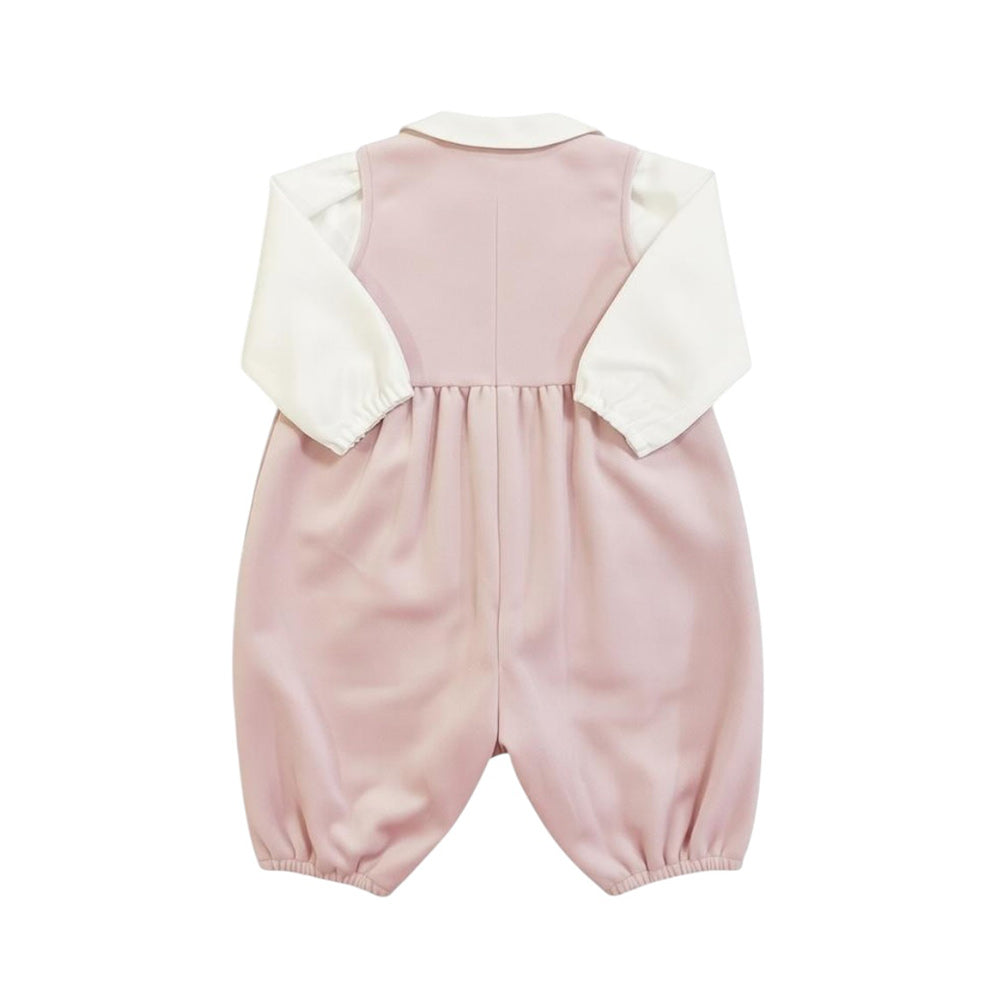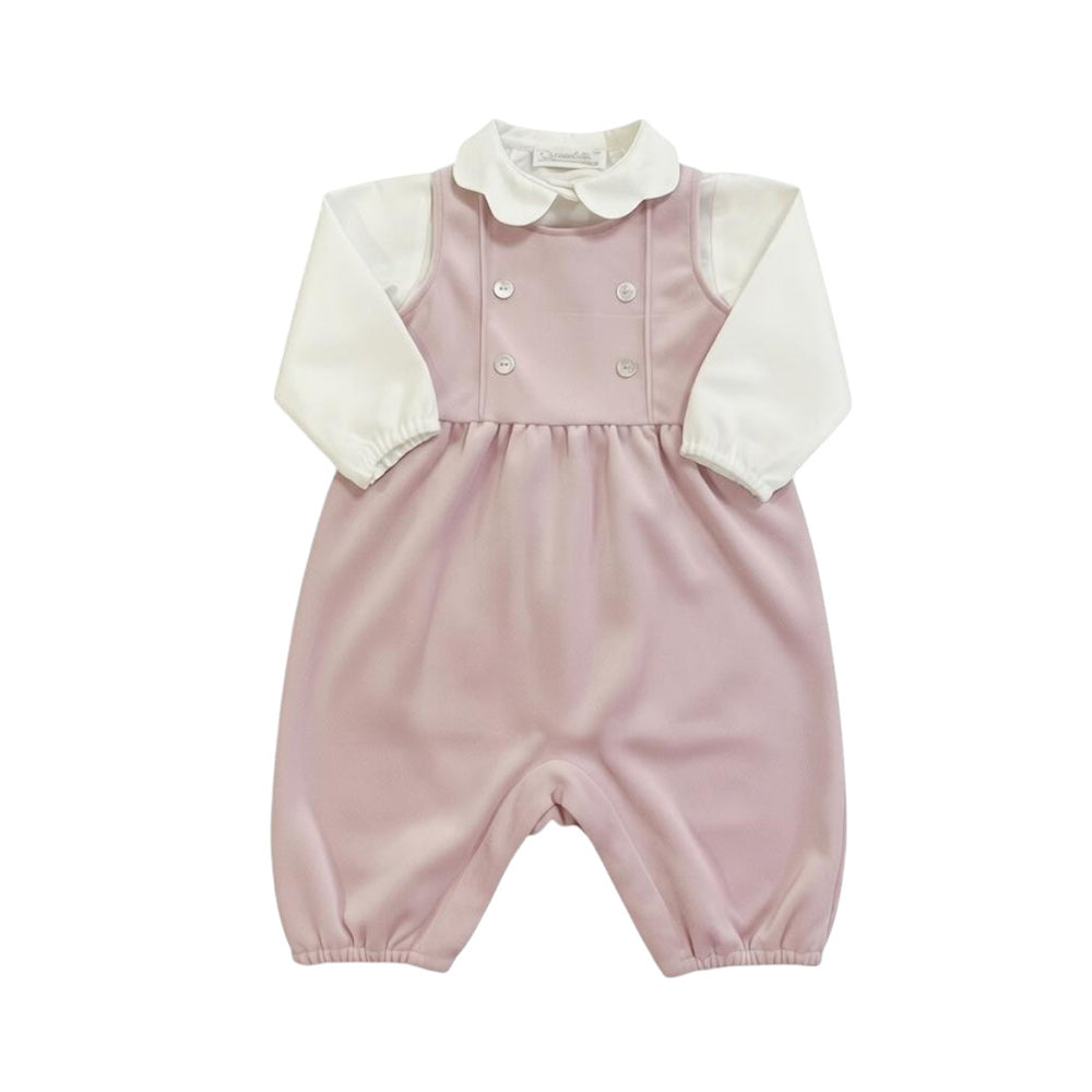 Salopette in velluto bottoncini sul davanti in madreperla con camicia collo a onde a body elastico ai polsini