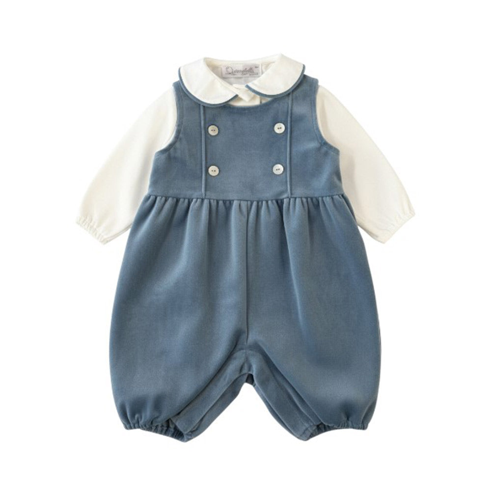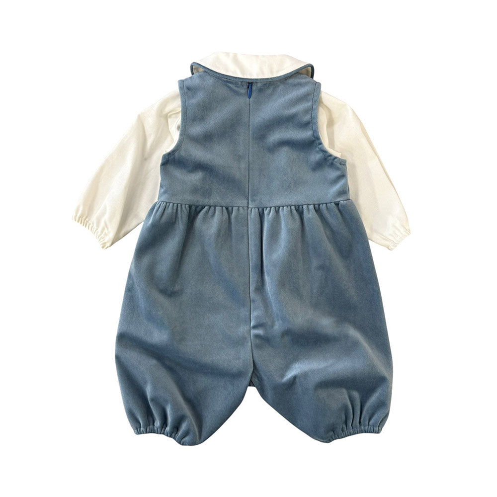 Salopette in velluto bottoncini sul davanti in madreperla con camicia collo tondo e bordino a contrasto a body elastico ai polsini