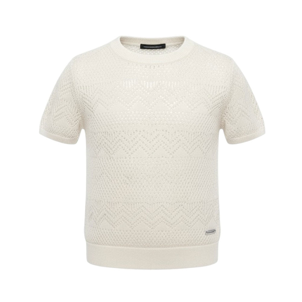 T-shirt realizzata in filato di misto cotone, caratterizzata da design traforato, scollo tondo, maniche corte e finiture a costine. È decorata con placca logo applicata sul davanti.