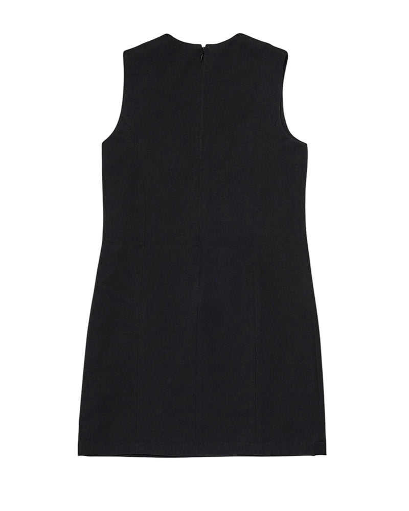 Abito nero senza maniche in fresco di lana, caratterizzato da collo tondo, lunghezza sopra il ginocchio, chiusura con cerniera posteriore e fodera interna in viscosa. È decorato con targa metallica ovale D applicata al petto.