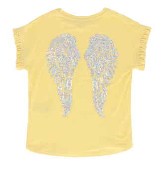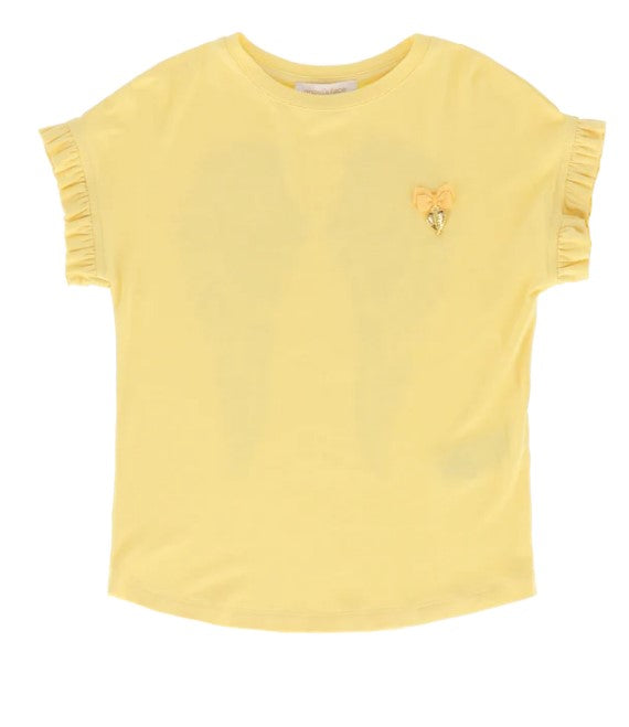 T-shirt girocollo a manica corta, applicazione fiocco con ciondolo a forma di cuore dorato sul petto. Paillettes in contrasto sul retro.