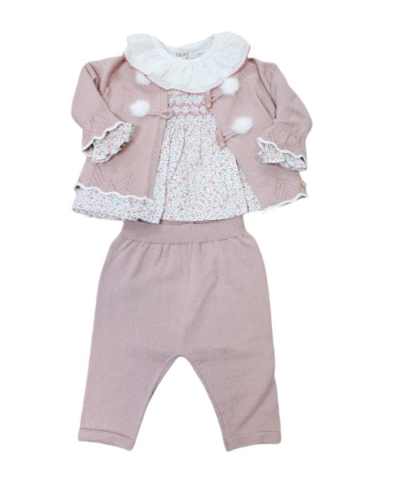 completo 3 pezzi casacca collo a rouches floreale con pantaloncino a ghetta senza piedini cardigan con pon pon in pelliccetta sul davanti chiusura con alamari