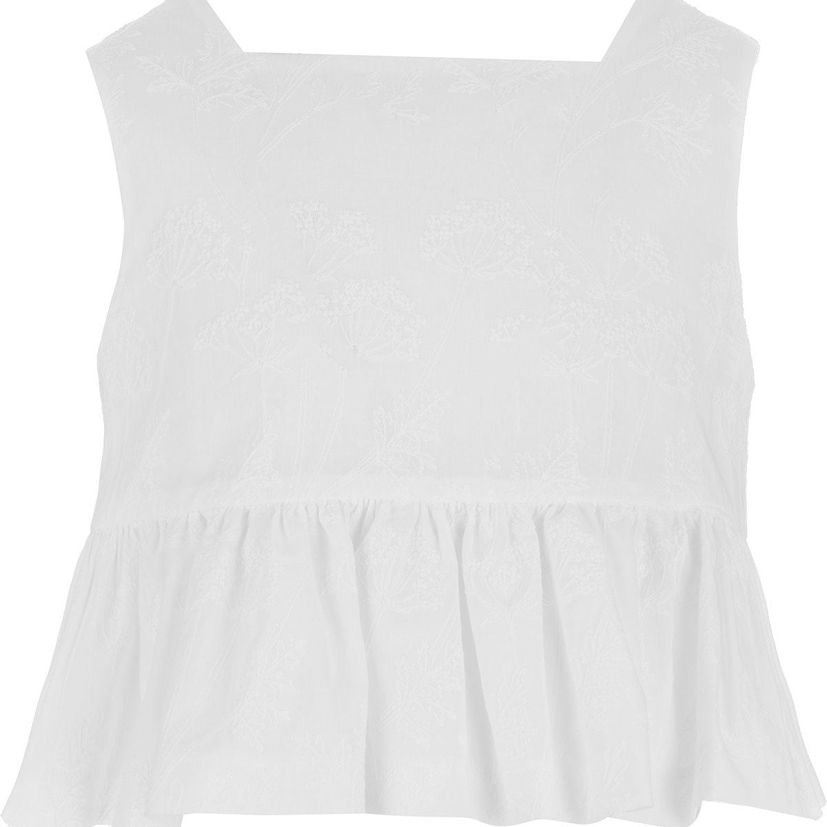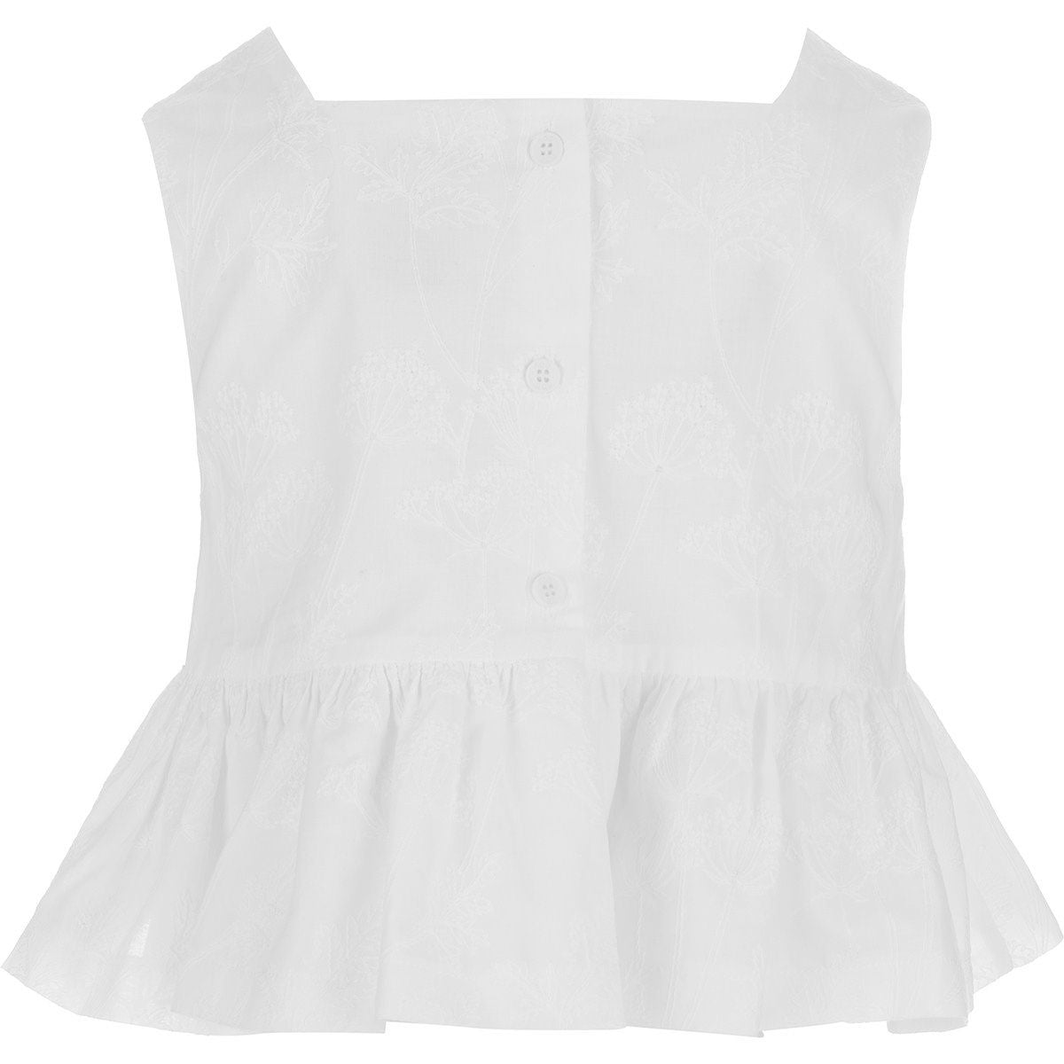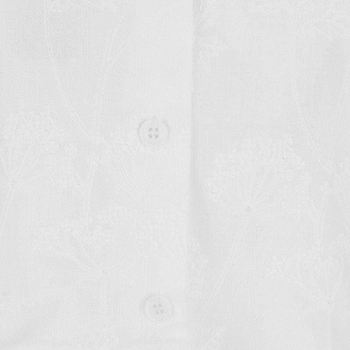 Casacca bimba a giromanica, tessuto ricamato, rouches all'orlo, chiusura di bottoni sul retro.