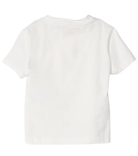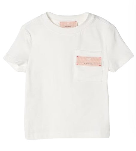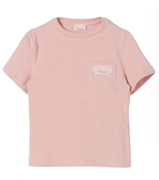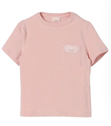T-shirt girocollo, manica corta, taschino e logo applicato sul davanti.