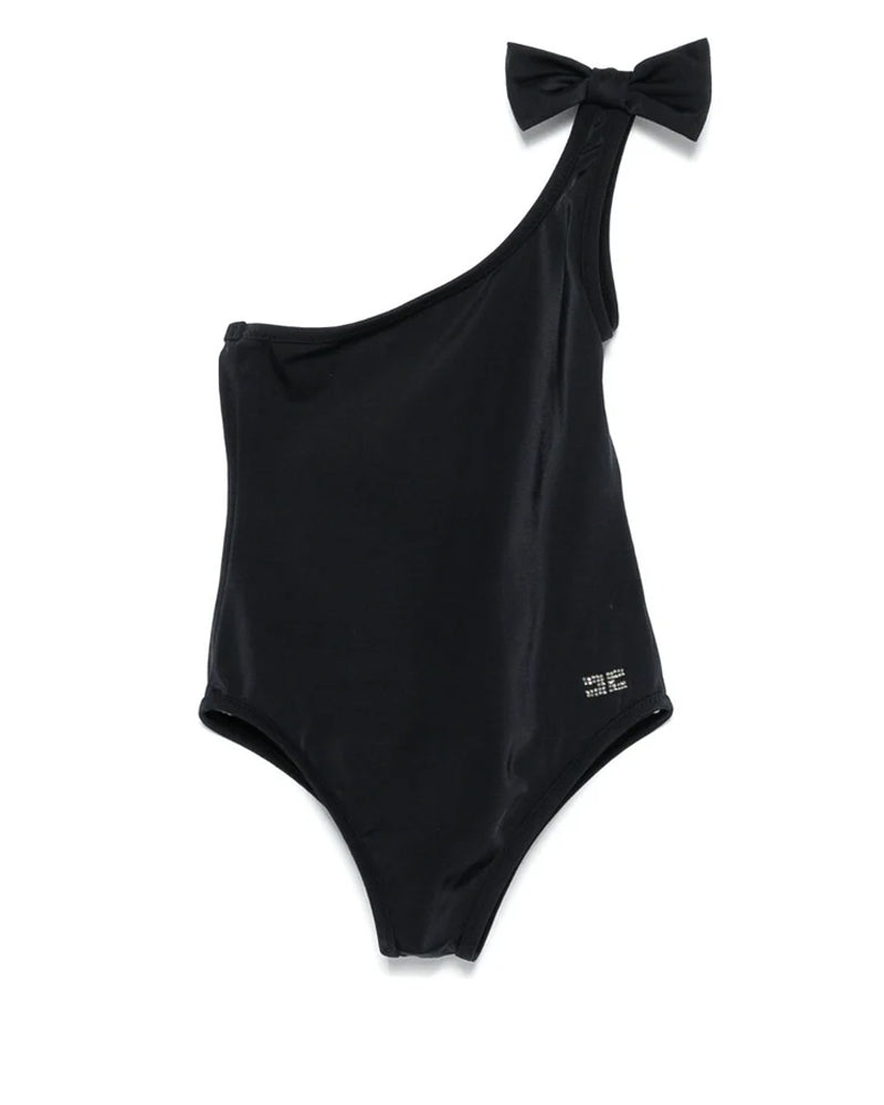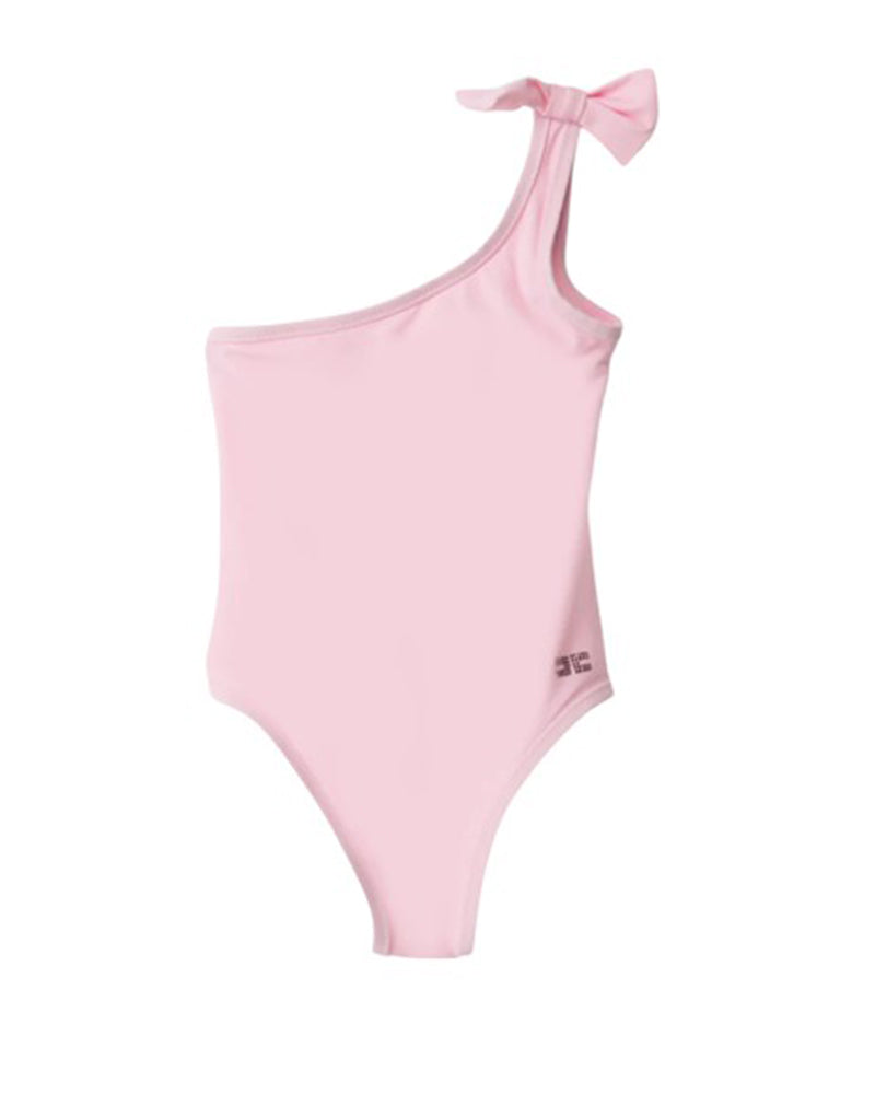 Costume intero monospalla da bambina con dettaglio a fiocco. È decorato con stampa logo in glitter sul lato.