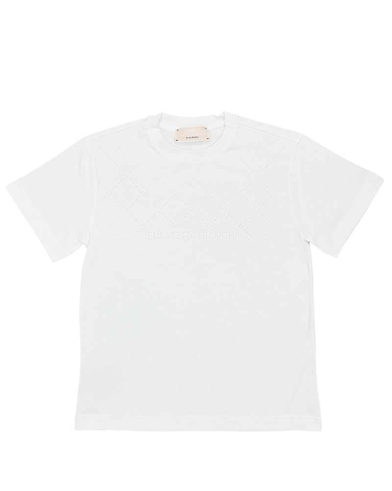 T-shirt realizzata in cotone da bambina di Elisabetta Franchi La Mia Bambina. Presenta collo tondo, maniche corte, applicazione logo con strass tone on tone sul davanti, orlo dritto.