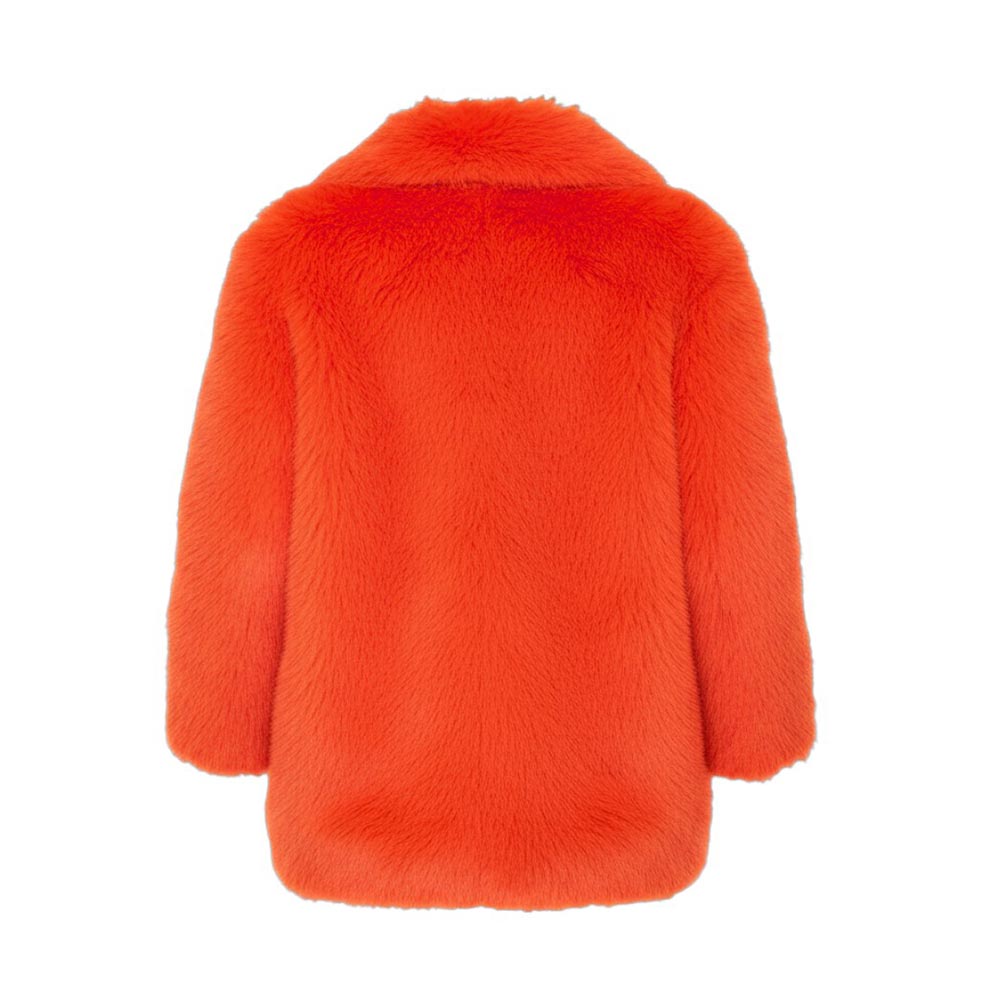 Ecopelliccia arancione da bambina, caratterizzata da colletto a punta, chiusura frontale con bottoni a pressione, maniche lunghe con polsi elasticizzati e apertura laterale con bottoni a pressione.
