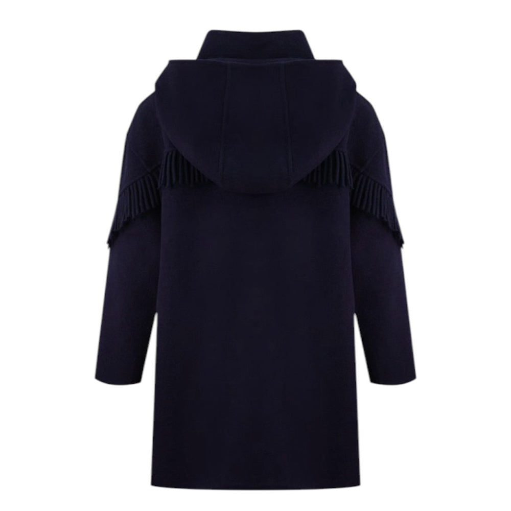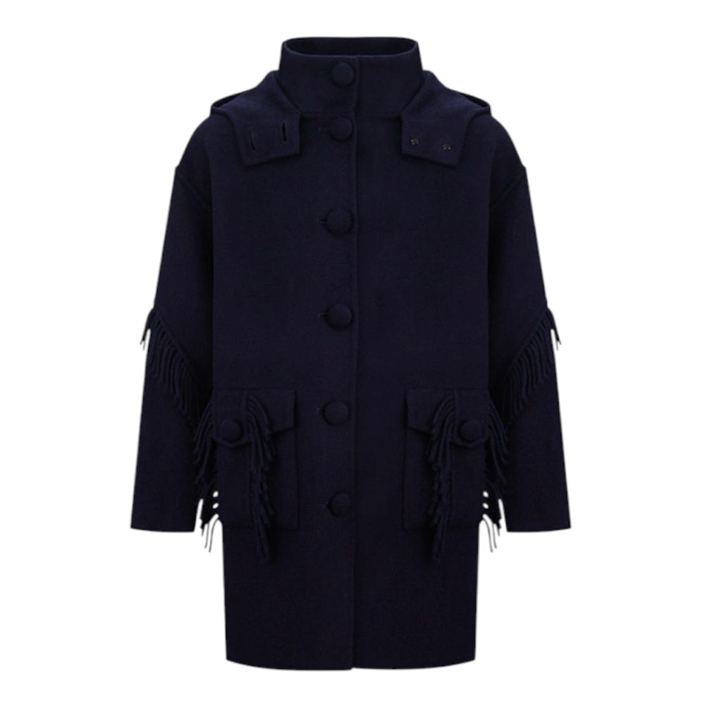 Cappotto monopetto realizzato in misto lana, caratterizzato da ampio cappuccio, collo alto, chiusura frontale con bottoni, maniche lunghe e due tasche con patta applicate sul davanti. È decorato con frange sulle maniche e sulle tasche.