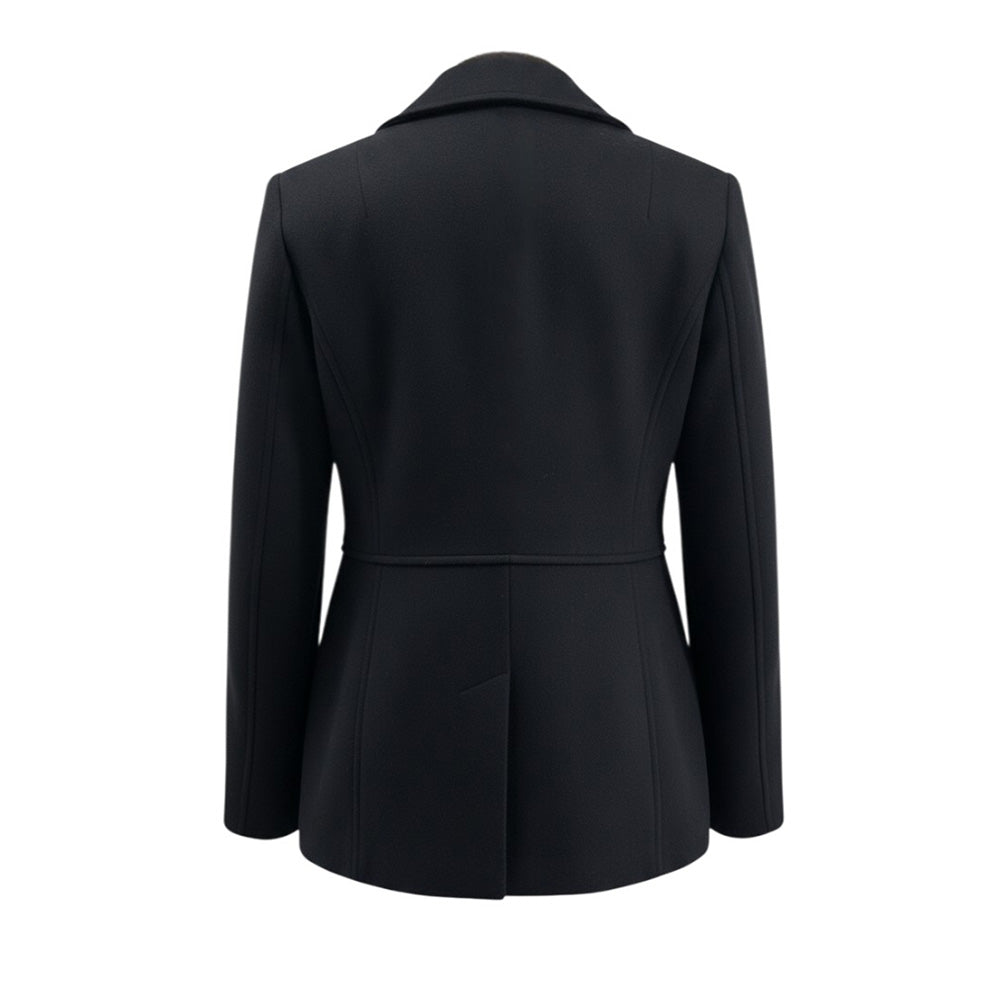 Cappotto monopetto realizzato in panno di misto lana e cashmere. Presenta colletto a punta, chiusura frontale con ganci, maniche lunghe con polsi in velluto, due tasche laterali a filetto e orlo dritto.