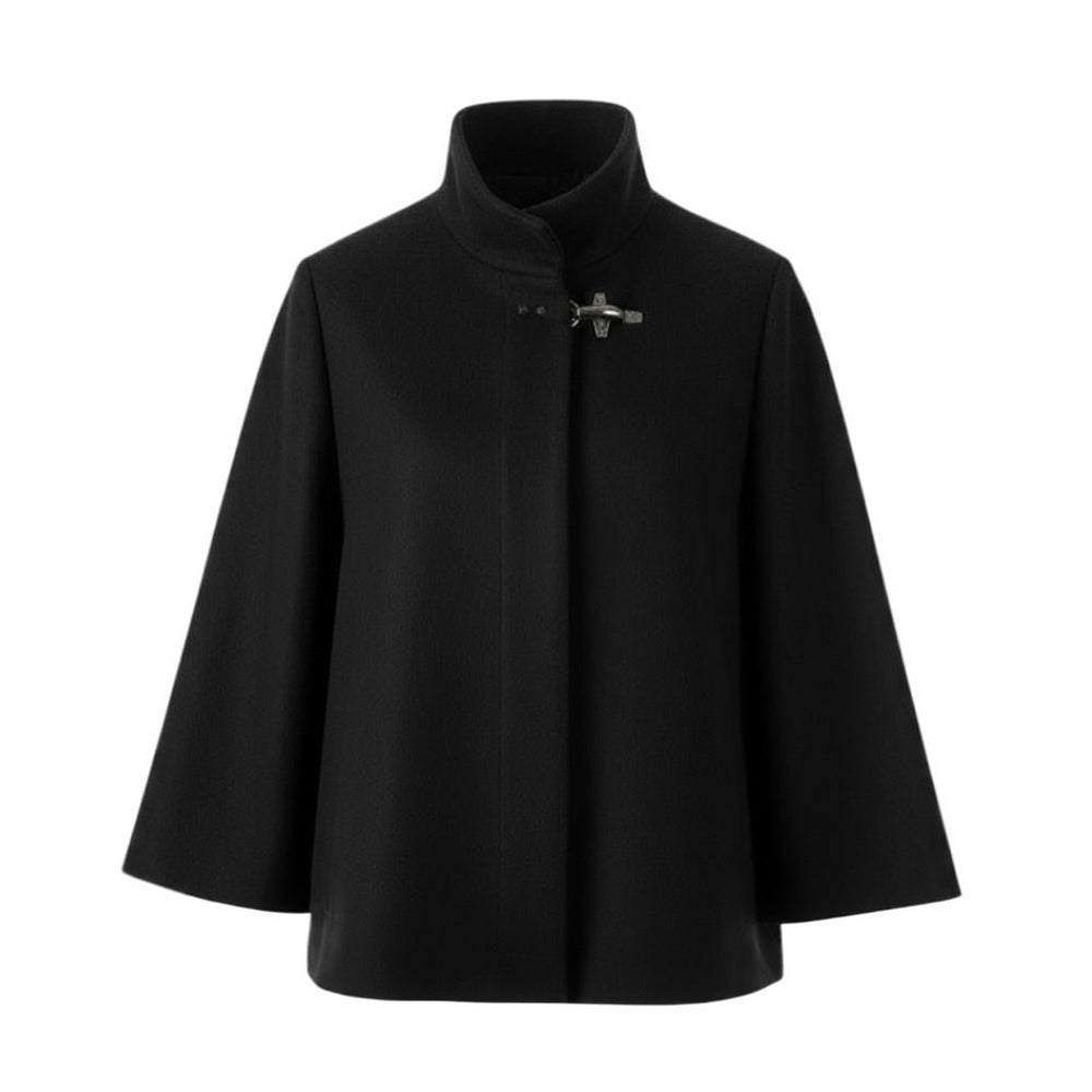 Cappa realizzata in misto lana, caratterizzata da collo alto, chiusura frontale con gancio e bottoni a pressione, maniche a 3/4, due tasche laterali a filetto e orlo svasato.