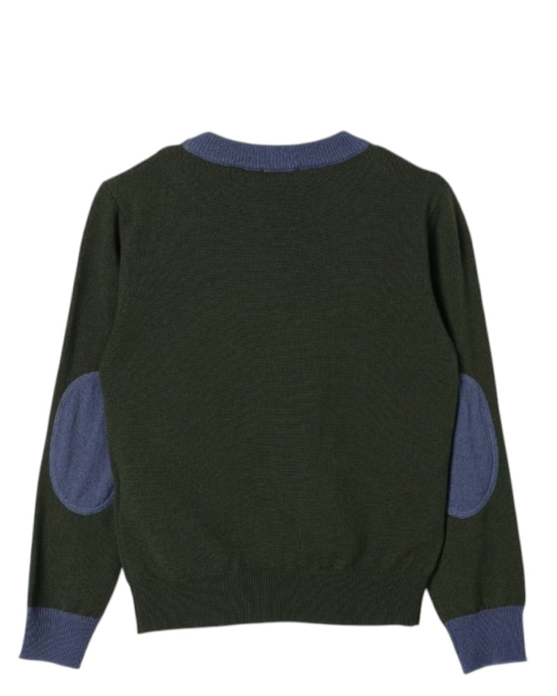 Maglia realizzata in misto lana e cashmere da bambino. Presenta collo tondo, maniche lunghe con toppe sui gomiti, logo ricamato sul petto e finiture a coste in contrasto.