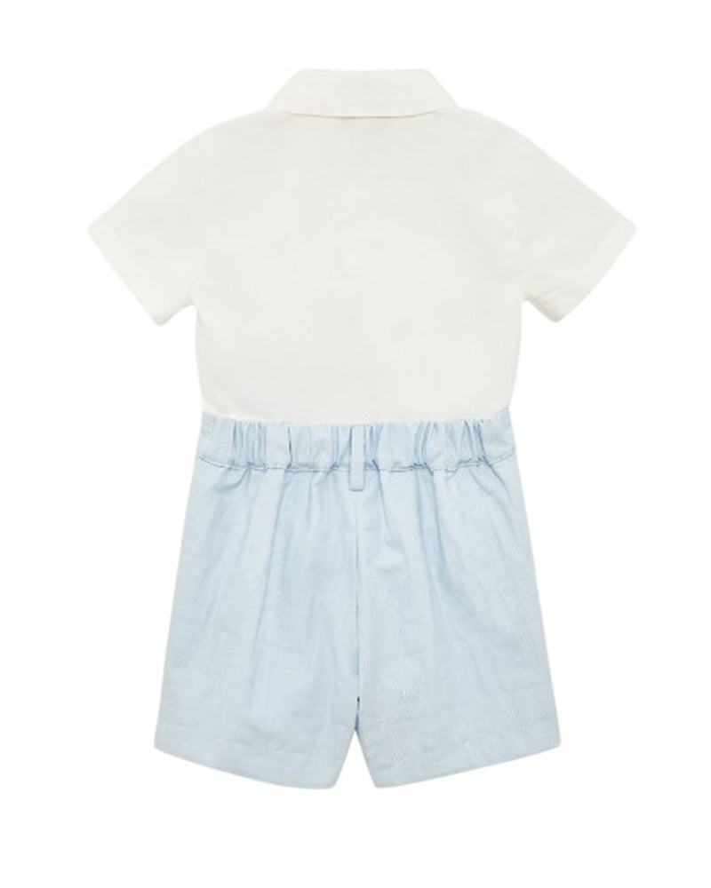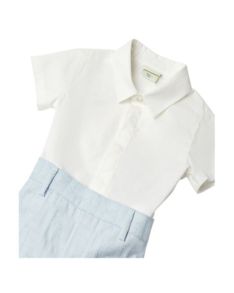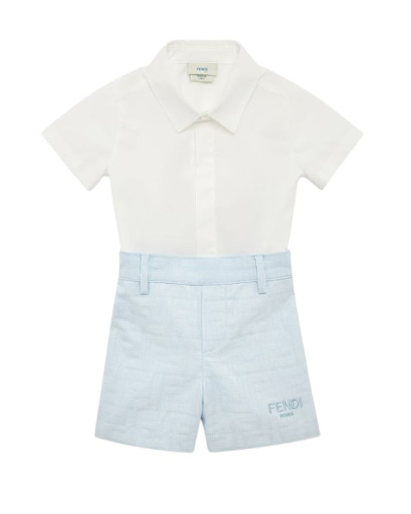 Tutina baby corta in popeline con logo tonale Fendi Roma sulla camicia color gesso e short azzurri con pince FF tone on tone allover.