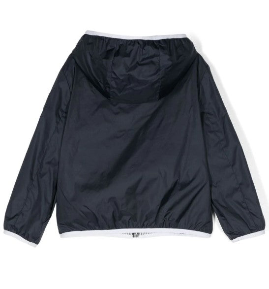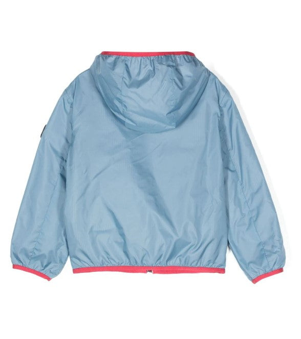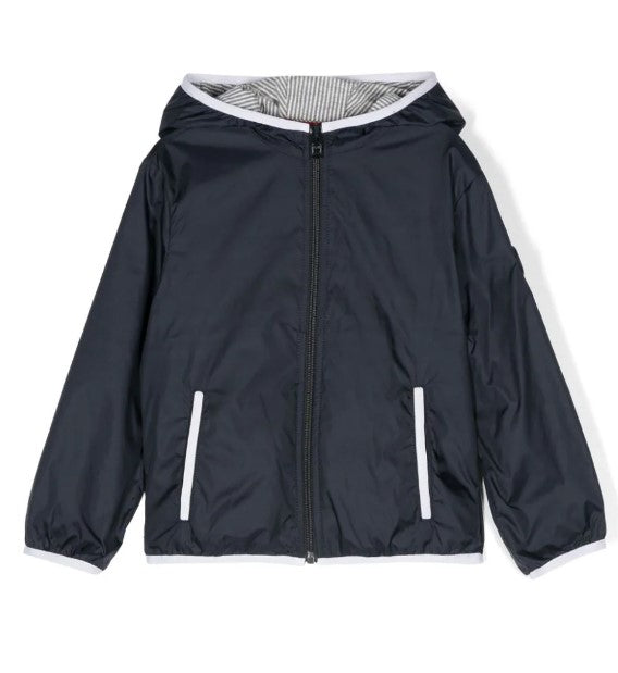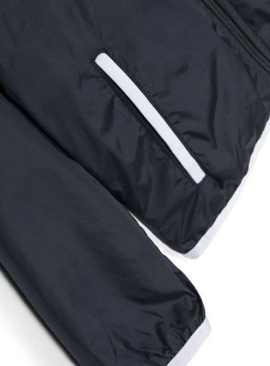 Giubbino con cappuccio, rivestimento esterno in materiale sintetico, bordi a contrasto, polsini elasticizzati, applicazione con logo gommato sulla manica, due tasche a filetto laterali, fodera in cotone, texture seersucker sulla fodera, orlo elasticizzato, chiusura frontale con zip.
