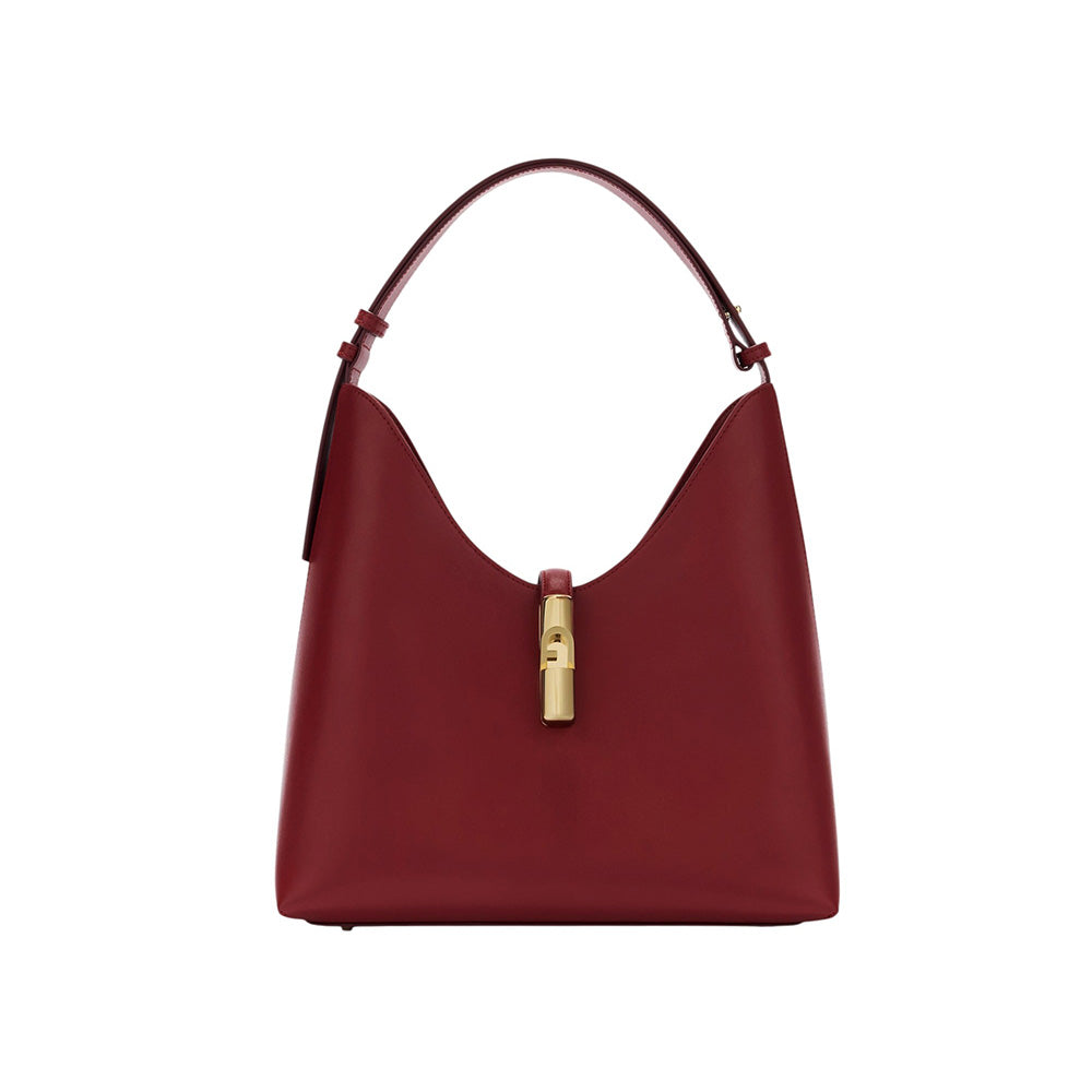 La borsa è arricchita da una fascetta abbinata impreziosita dal nuovo hardware ciclindrico con pesetto decorato dall'iconico logo Arco Furla che tiene chiuso il modello. L'interno aperto è capiente e spazioso per contenere i propri essentials.