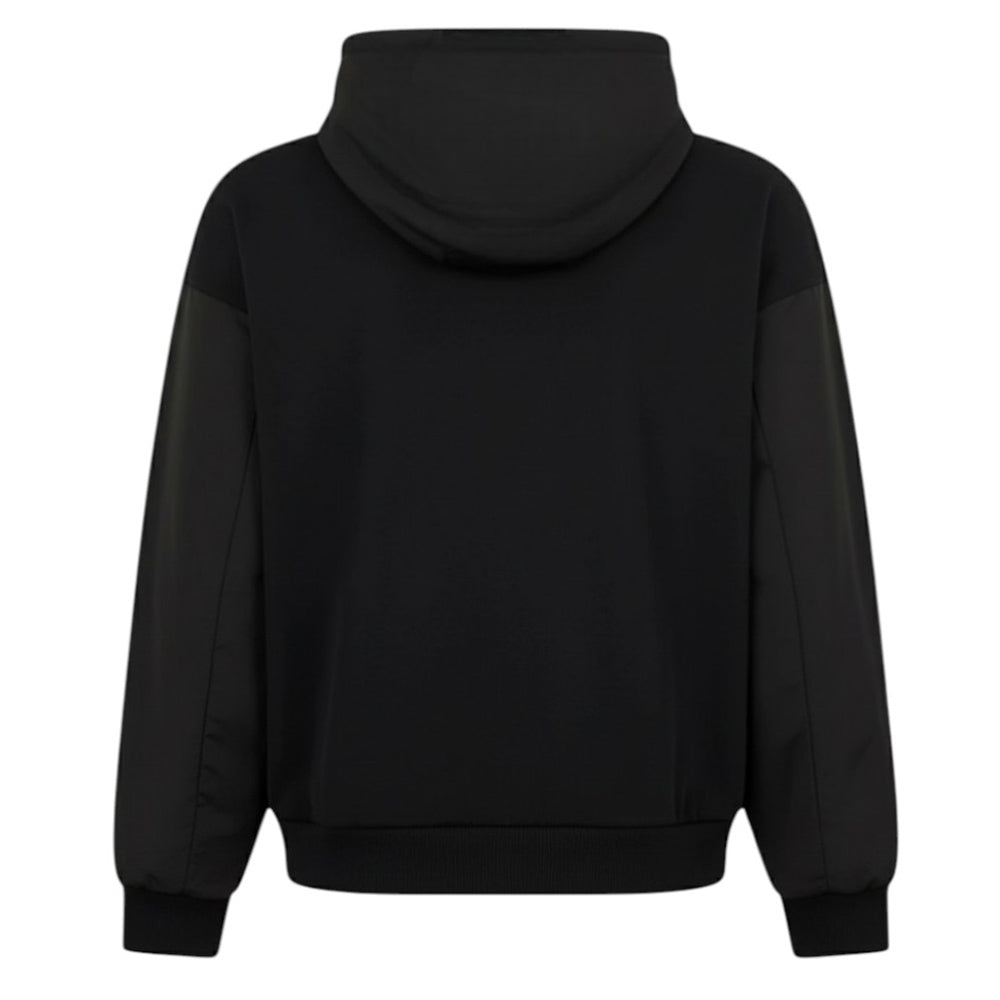 Felpa realizzata in cotone sgarzato, caratterizzata da cappuccio in nylon con coulisse, chiusura frontale con zip, maniche lunghe in nylon, due tasche a marsupio sul davanti, polsi e orlo a costine. È decorata con banda logo sul davanti.