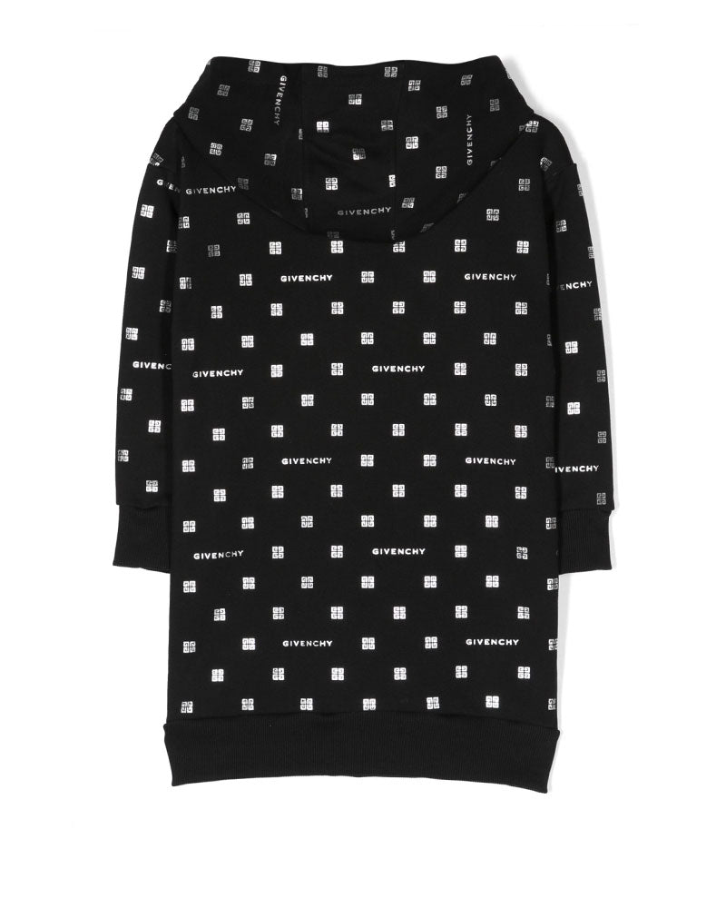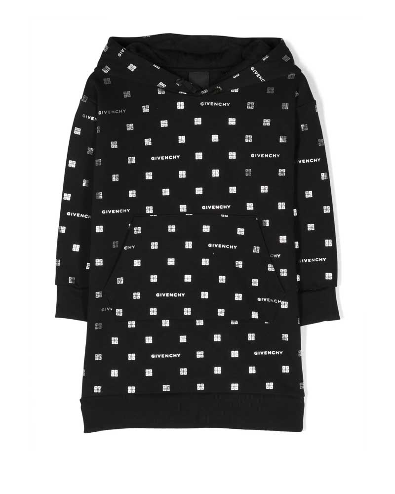 Abito in felpa di cotone con cappuccio da bambina. Manica lunga, fantasia logo all over, tasca a marsupio sul davanti, rifiniture a costa.