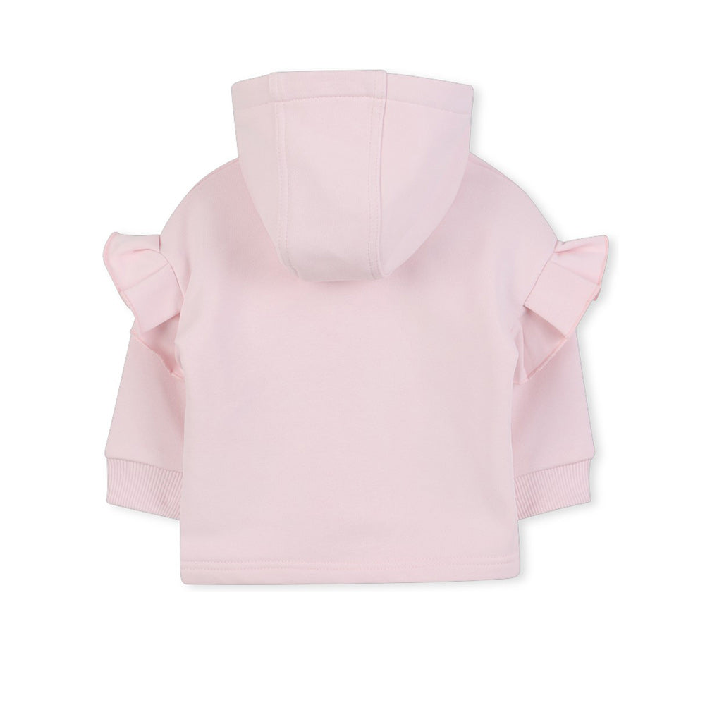 Felpa realizzata in cotone garzato, caratterizzata da cappuccio, chiusura frontale con zip, maniche lunghe, due tasche applicate sul davanti, polsi e orlo a coste. È decorata con rouches sulle spalline e logo stampato sul davanti.