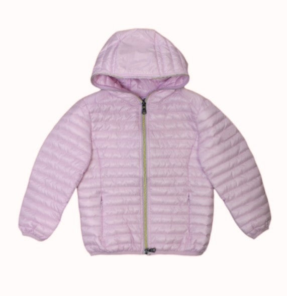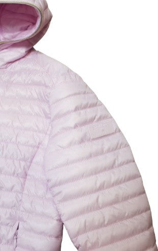 Giubbino trapuntato con cappuccio fisso, chiusura anteriore con zip, logo applicato sul davanti, tasche laterali con zip.