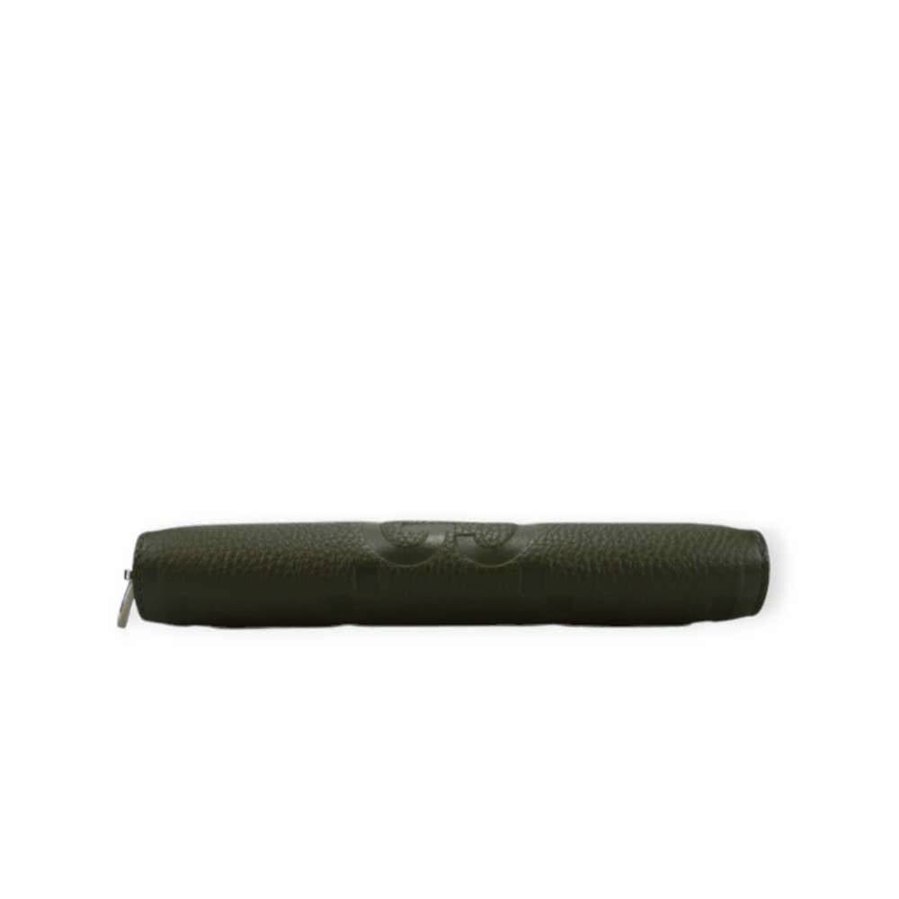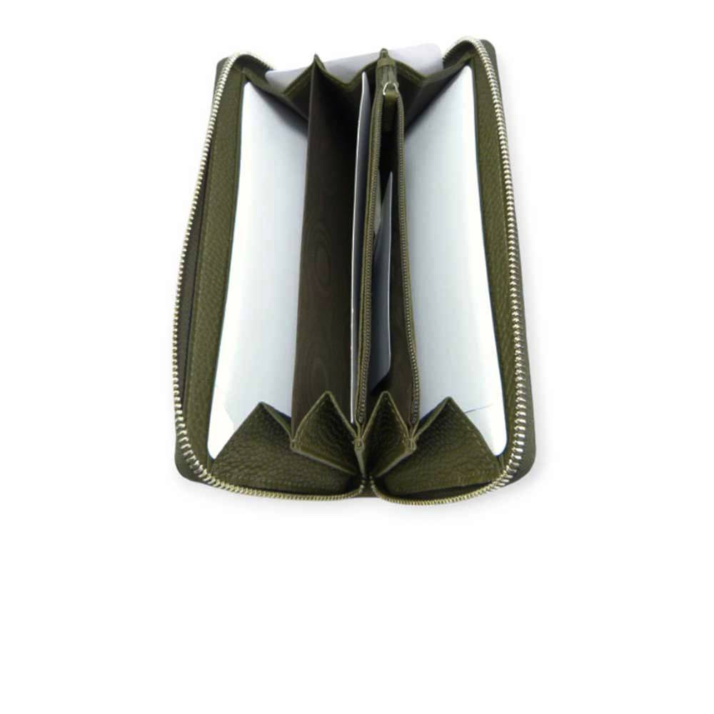 in pelle di colore verde militare, fodera moiré, interno con 12 scomparti per carte di credito, 3 scomparti per banconote, 1 tasca portamonete con cerniera e chiusura con cerniera.