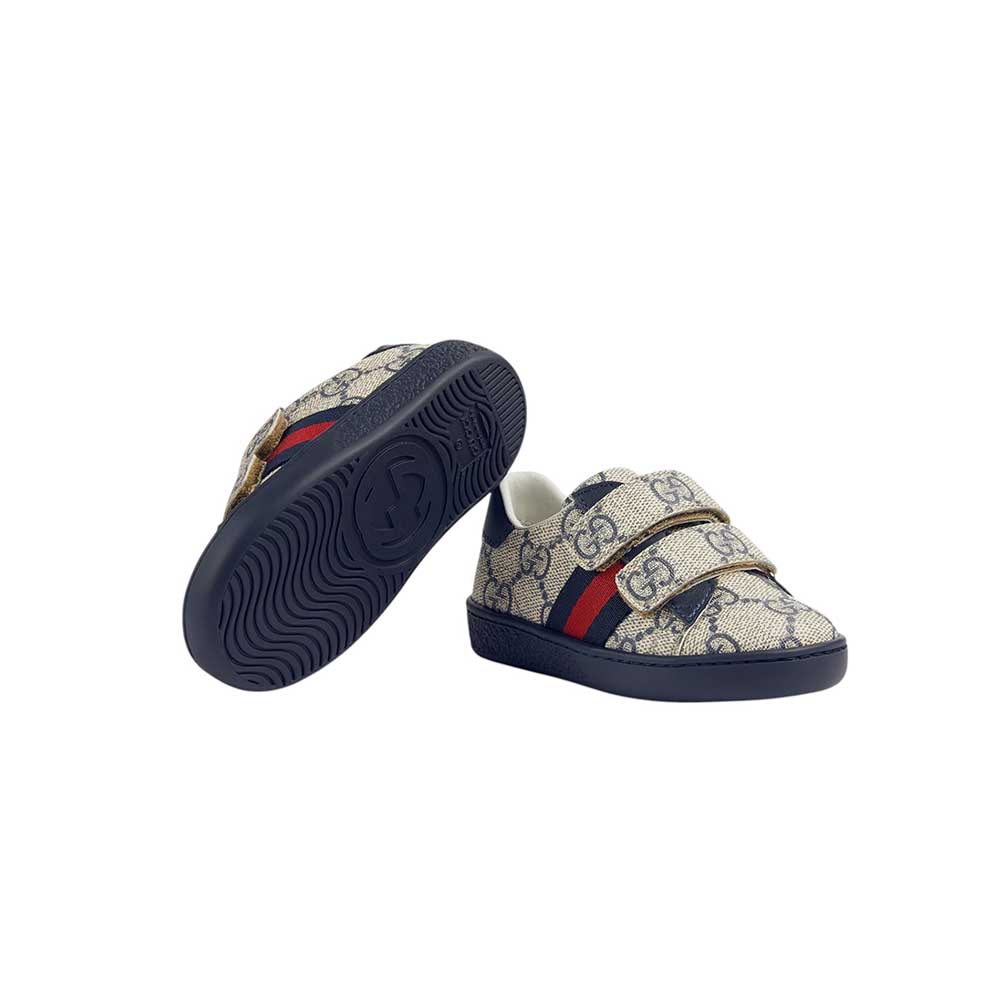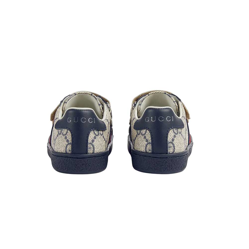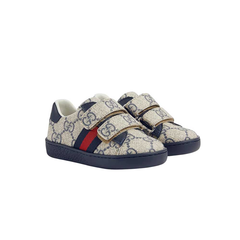 Vestiti per l'avventura con le sneakers Gucci Ace 463090 FAGYF4055! La finitura in pelle blu e il nastro Web blu e rosso si combinano in uno stile senza tempo, mentre la suola in gomma ti darà una base stabile per i tuoi movimenti audaci. Facili da indossare con il cinturino in velcro, queste sneakers sono perfette per il tuo piccolo esploratore!