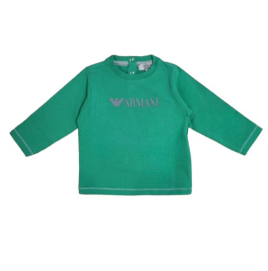 T-shirt girocollo a maniche lunghe con logo e simbolo applicato sul davanti, chiusura con bottoni a pressione sul retro.