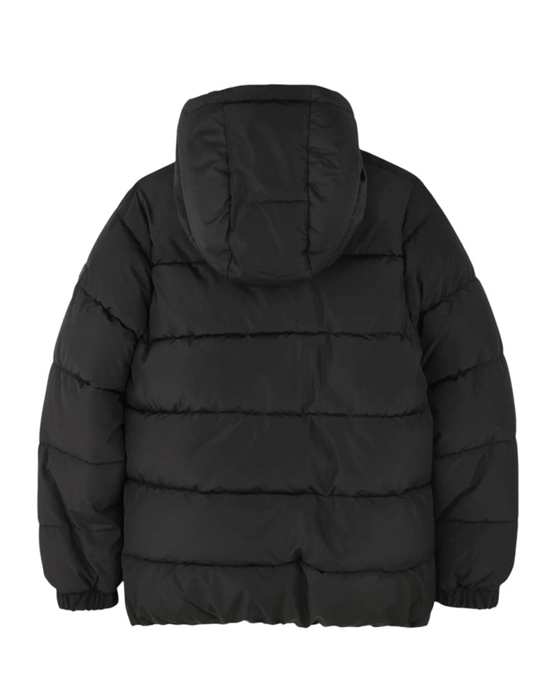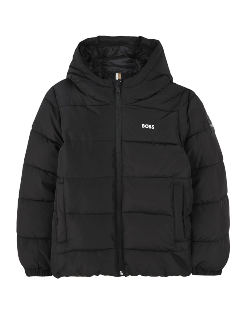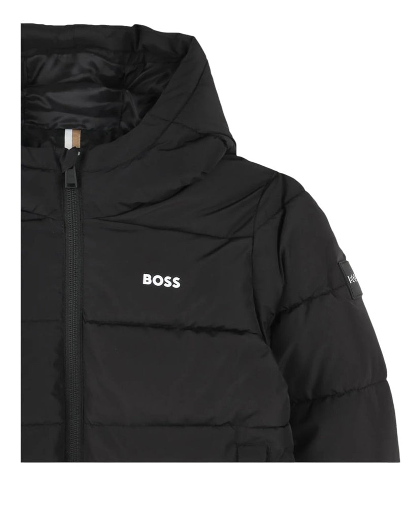 Giubbino imbottito da bambino. Presenta design trapuntato, cappuccio fisso, maniche lunghe con polsi elasticizzati, chiusura frontale con zip, due tasche frontali a filo. È decorato con stampa logo sul petto e patch logata sulla manica.