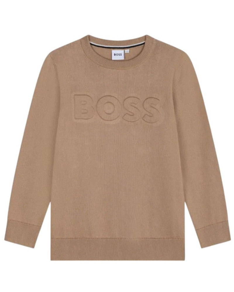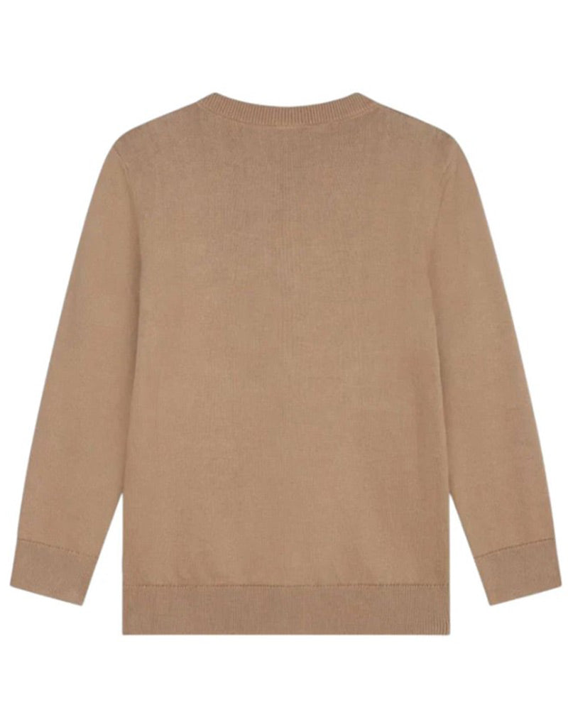 Maglia realizzata in filato di cotone da bambino. Presenta collo tondo, maniche lunghe, logo in rilievo tone on tone sul davanti e finiture a coste.