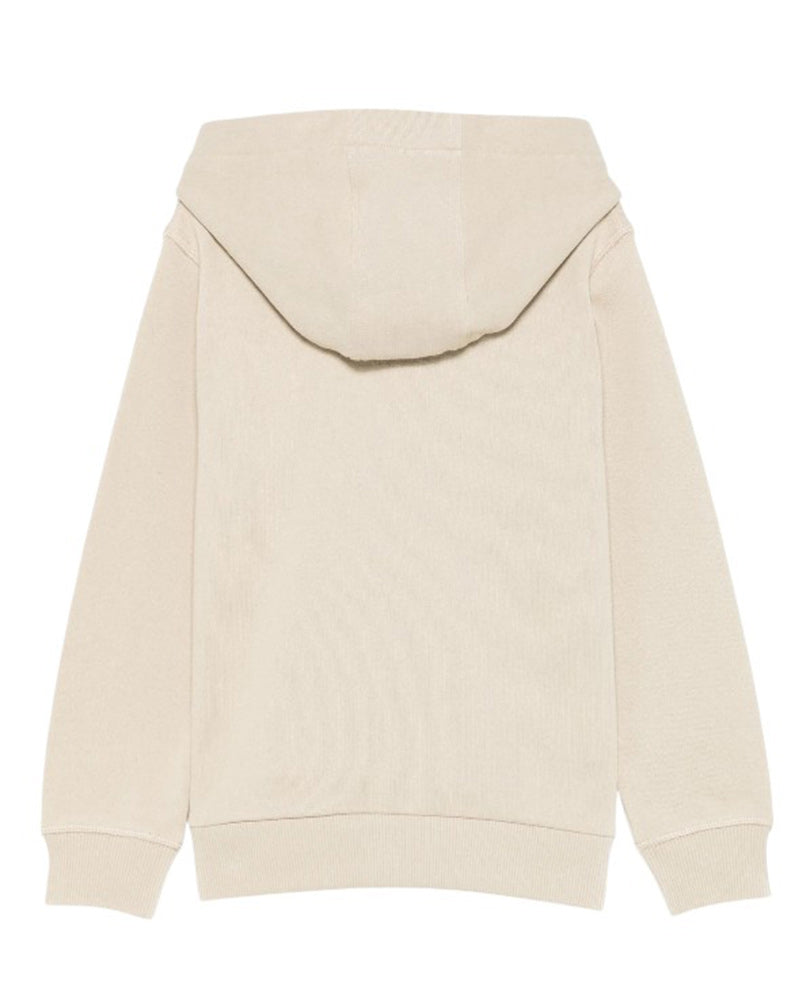 Felpa da bambino realizzata in cotone garzato. Presenta cappuccio, maniche lunghe, tasca a marsupio sul davanti, fodera in pile, orlo e polsi a coste. È decorata con logo ricamato sulla parte anteriore.