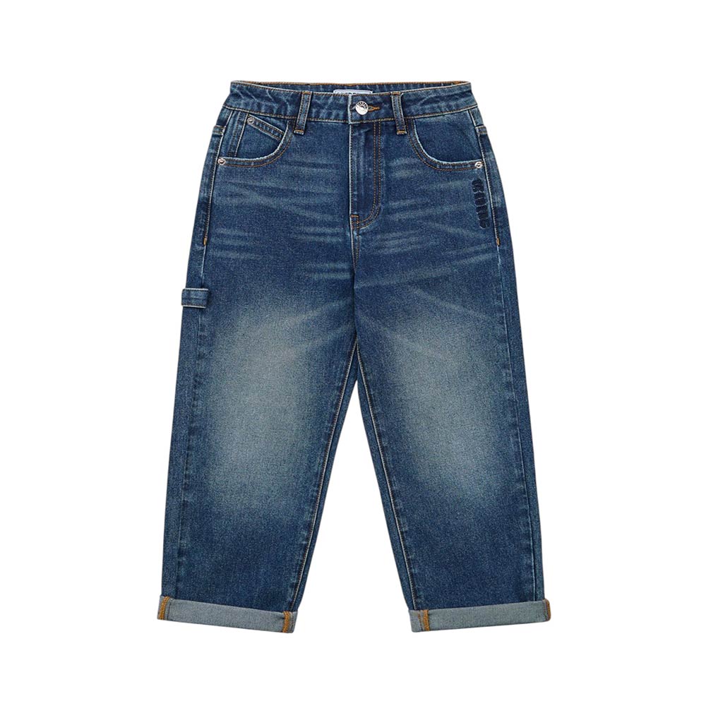 Jeans realizzati in denim di cotone blu scuro. Modello cinque tasche. Chiusura frontale con bottone e zip, vita regolabile grazie ad elastico interno con bottoni, passanti per cintura e logo ricamato sul davanti e sul retro.