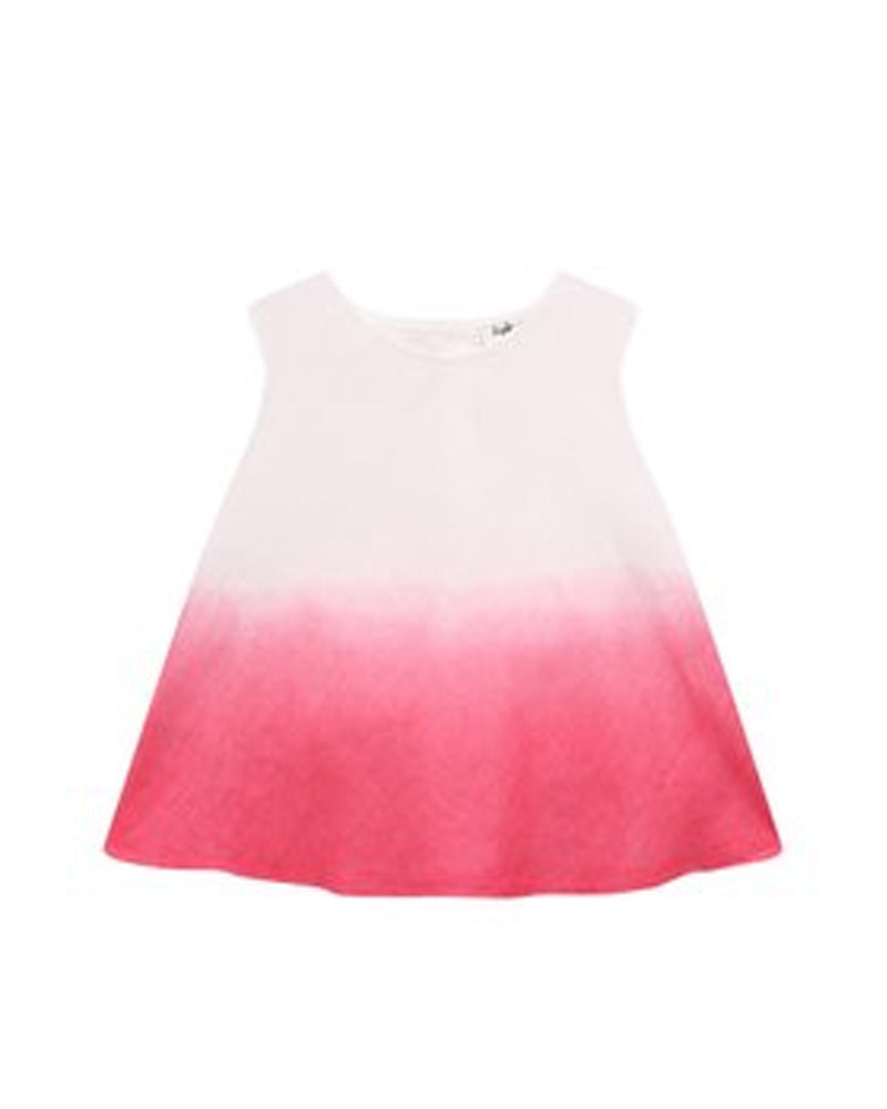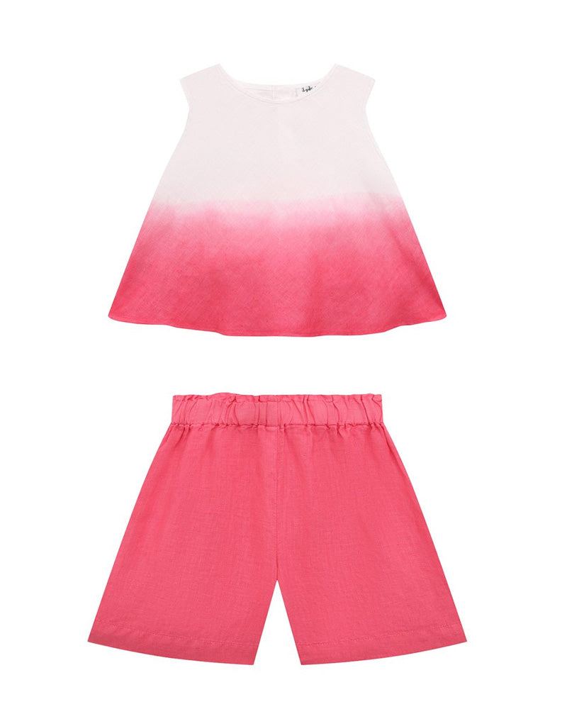 Completo composto da top e short's. Top effetto sfumato, presenta uno scollo rotondo e una silhouette senza maniche. È arricchito da una mini targhetta con logo. L'orlo è curvo e si chiude sulla parte posteriore con un bottone. Short's con una lunghezza sopra il ginocchio, questi pantaloni sono dotati di una vita elasticizzata.