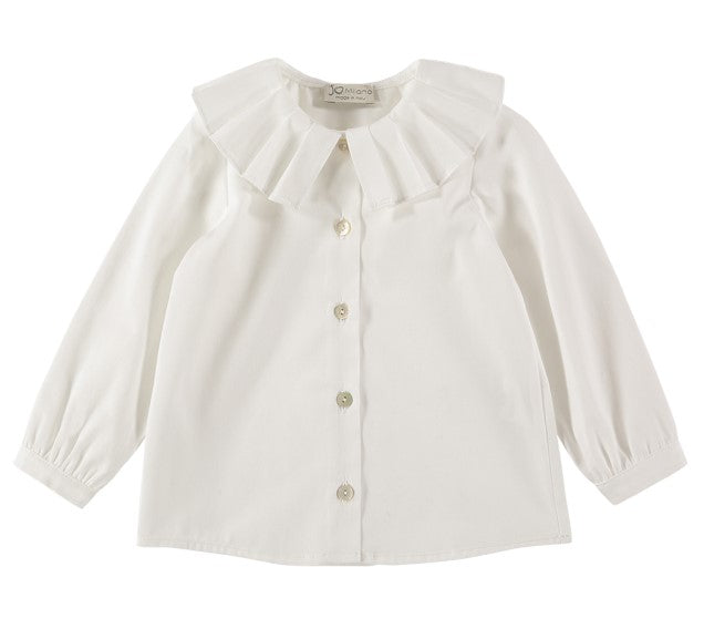 Camicia in cotone con volant sul collo, manica lunga, chiusura frontale con bottoncini.
