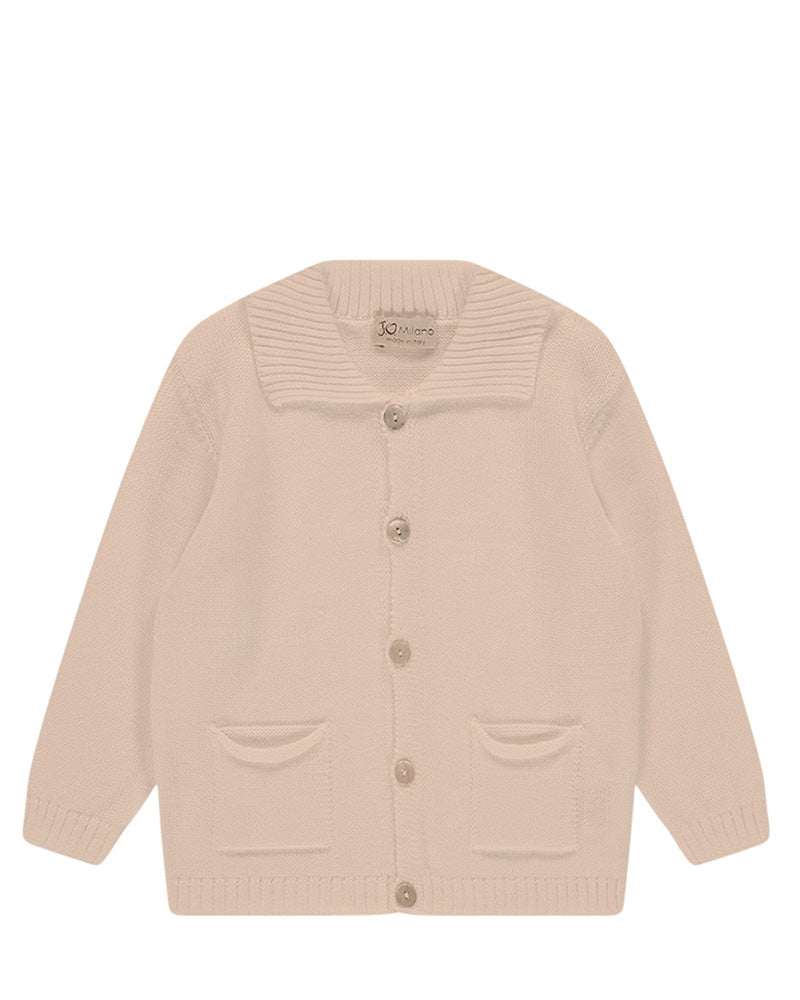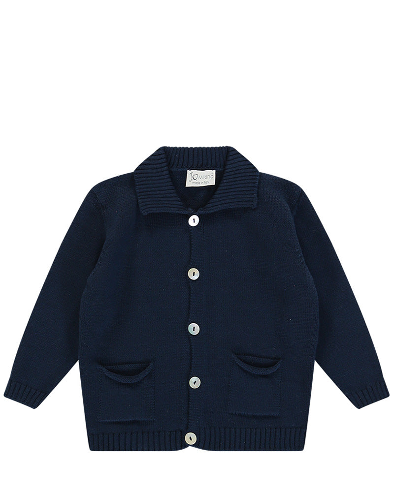 Maglia cardigan realizzata in filo di cotone, abbottonatura frontale, colletto in costa, taschine applicate sul davanti.