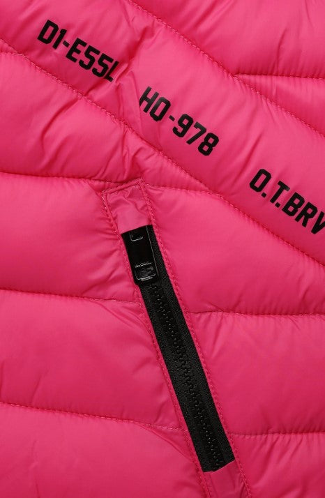 Giubbino trapuntato smanicato con cappuccio, chiusura anteriore con zip, tasche laterali con zip, logo stampato sul davanti.