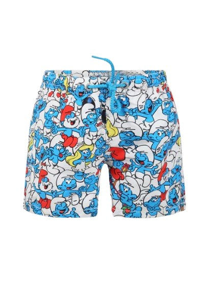 Costume bambino modello boxer di media lunghezza. Vita elasticizzata con coulisse. Tasche laterali a filo ed una tasca posteriore applicata con chiusura magnetica. Fantasia Puffy all over.