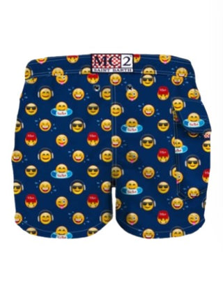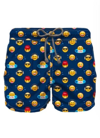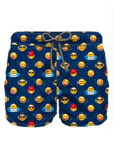 Costume bambino modello boxer di media lunghezza. Vita elasticizzata con coulisse. Tasche laterali a filo ed una tasca posteriore applicata con chiusura magnetica. Fantasia Emoji all over.