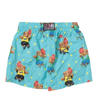 Costume bambino modello boxer di media lunghezza. Vita elasticizzata con coulisse. Tasche laterali a filo ed una tasca posteriore applicata con chiusura magnetica. Fantasia Teddy Padel all over.