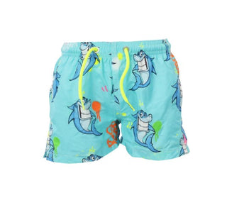 Costume bambino modello boxer di media lunghezza. Vita elasticizzata con coulisse. Tasche laterali a filo ed una tasca posteriore applicata con chiusura magnetica. Fantasia Shark all over.